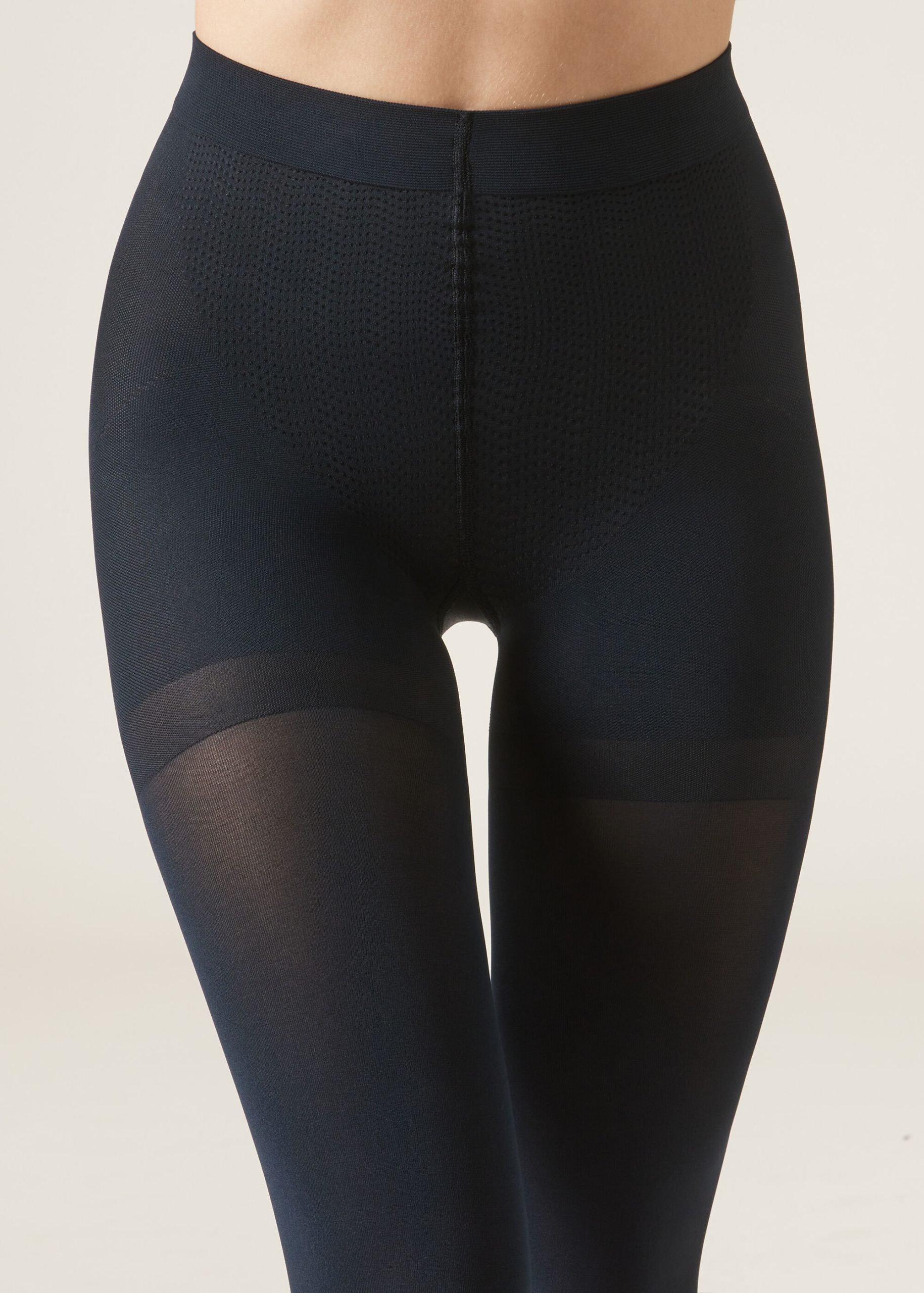 80 denier super opaque tights with lightly graduated compression. The shaping line is designed to sculpt the silhouette. Thanks to the particular characteristics of the material and the construction, the total shaper effect contours the stomach, hips and buttocks. Reinforced top and toes, flat seams, cotton gusset.