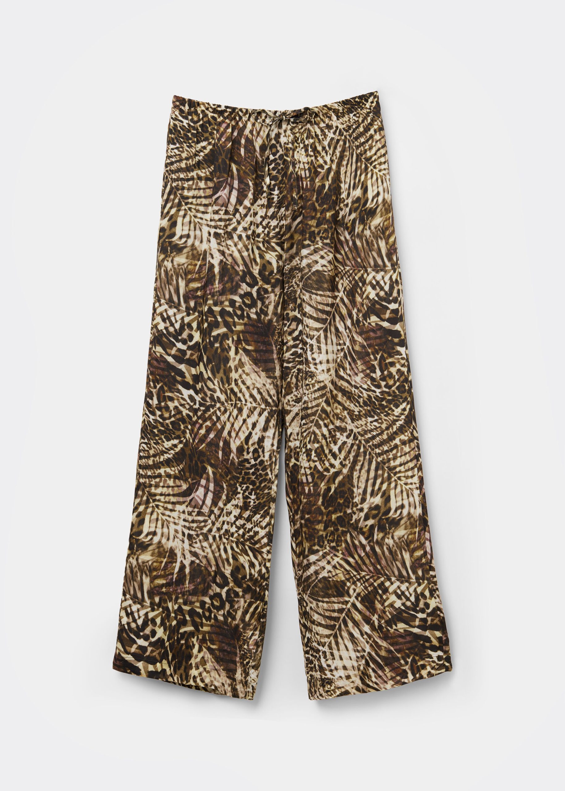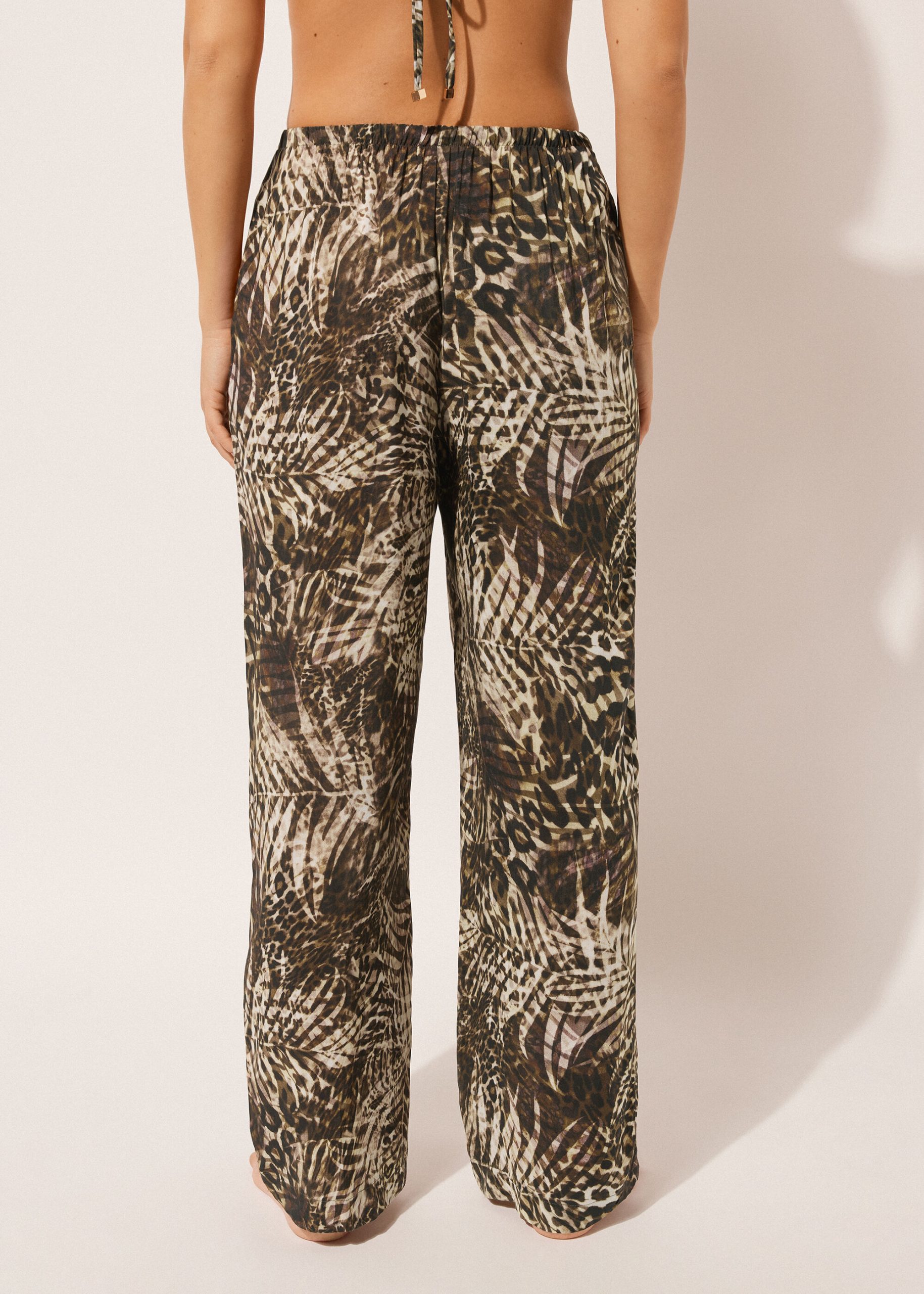 Elevate poolside relaxation into an artform with these statement animal print pants, offering a complex jungle motif that is the perfect striking contrast to white or black swimwear. The classic blend of subtle leopard print and leafy elements creates an exotic and mysterious appearance which pairs perfectly with the glamor of a large sunhat and shades.The lightweight construction offers great sun protection while still offering a lightweight and breezy construction that will keep you cool on the hottest summer days. These pants also dry quickly, keeping you comfortable as you transition from the water. The elasticated waistband of these jungle print pants also makes them easy to take off over your swimwear! Pair these baggy beach pans with a matching cropped shirt and create a lightweight outfit that effortlessly transitions from the beach to a sophisticated vacation lunch.