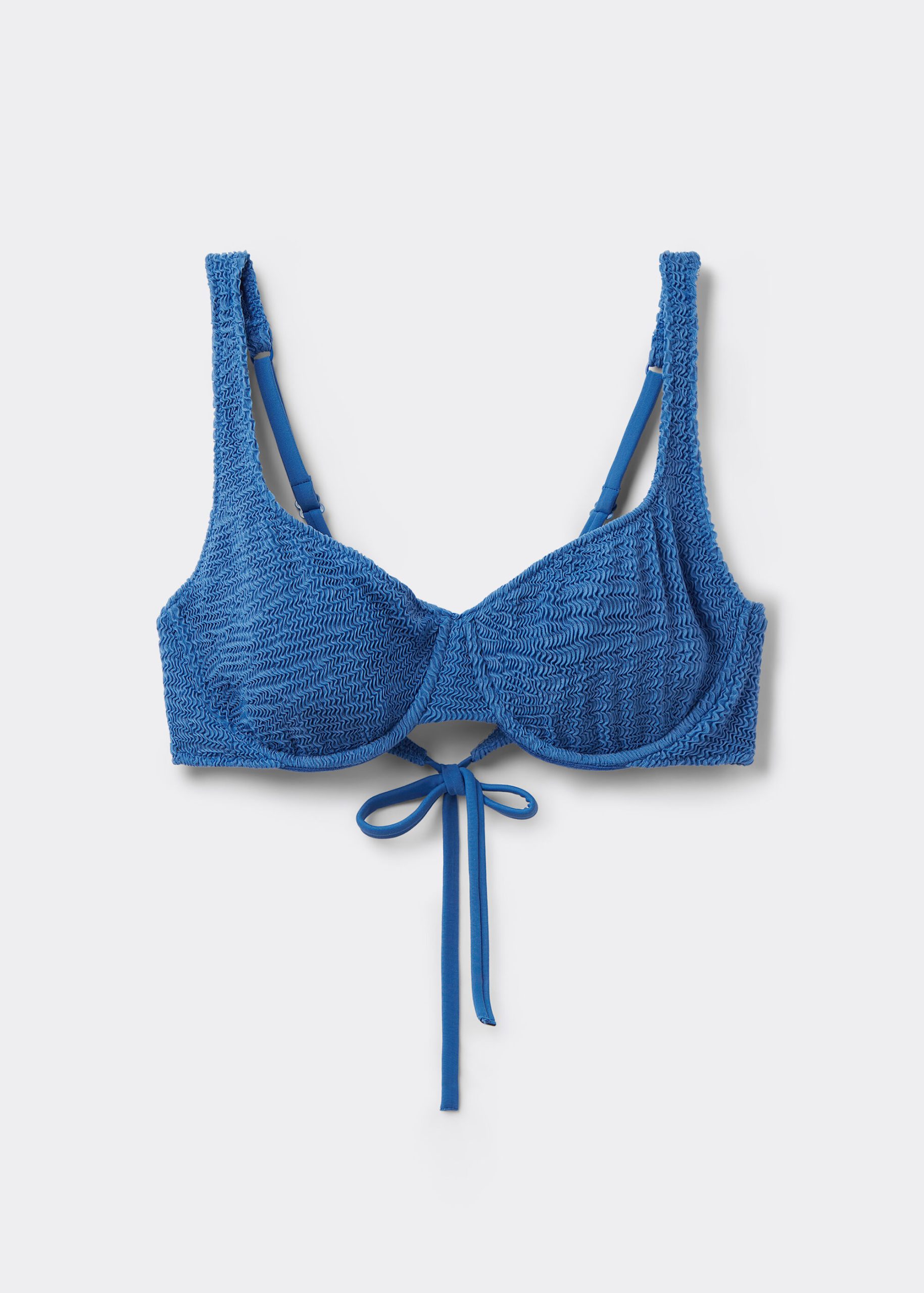 Unpadded balconette bikini top with underwire. The structure of the cups perfectly embraces and supports the bust, while the side drawstring can adjust the fit. Ideal for larger busts. The style features a crinkle fabric with a three-dimensional effect. Adjustable straps and thin tie closure on the back.