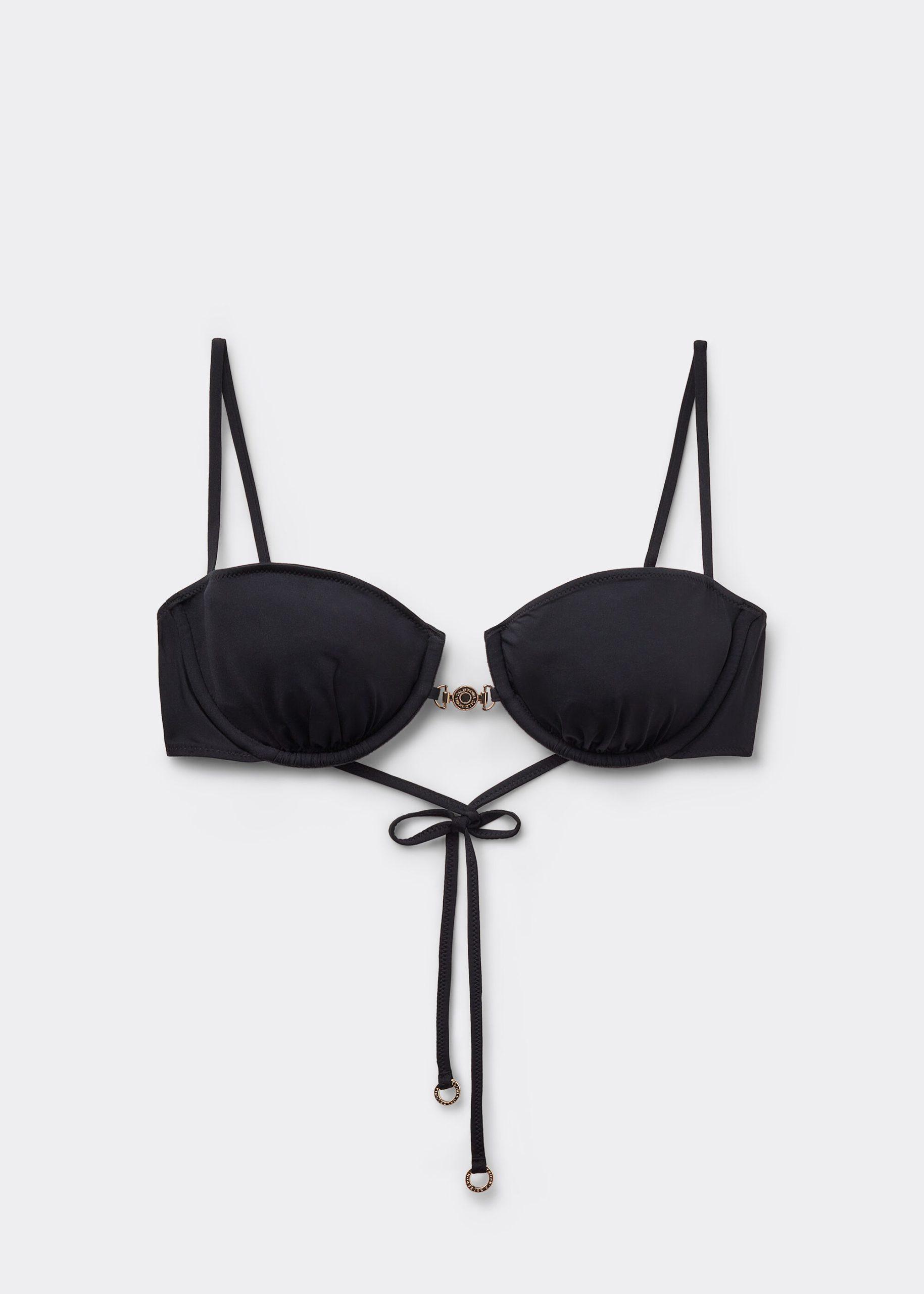 Unpadded balconette swimsuit top with underwire, featuring a minimal fit that exalts the silhouette with a touch of sensuality and refinement. The bright silk-effect fabric embellished by elegant golden details radiates a sophisticated sensation of discrete luxury. Adjustable shoulder straps and string tie fastening complete the design for this summer look that does not pass by unnoticed.