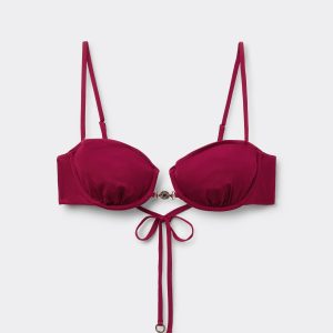 Unpadded balconette swimsuit top with underwire, featuring a minimal fit that exalts the silhouette with a touch of sensuality and refinement. The bright silk-effect fabric embellished by elegant golden details radiates a sophisticated sensation of discrete luxury. Adjustable shoulder straps and string tie fastening complete the design for this summer look that does not pass by unnoticed.