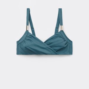 Unpadded balconette bikini top with underwire, embellished with an elegant central crisscross detail. The structure of the cups and the wide fit at the sides provide good support for larger busts. The compact fabric, designed to exalt and enhance the body’s curves, ensures excellent support and is studied to make every woman feel at ease without constraint. Adjustable shoulder straps. Back closure with two hook-and-eye closures to improve the fit of the underband.