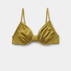 Unpadded balconette bikini top with underwire. The structure of the cups perfectly embrace and support the bust, thanks to the side drawstring on the cups that can also adjust the fit. Ideal for the larger bust. The style features a bright fabric with a silky effect, embellished by ruffles and gold tips. Adjustable straps and hook closure with two adjusters.