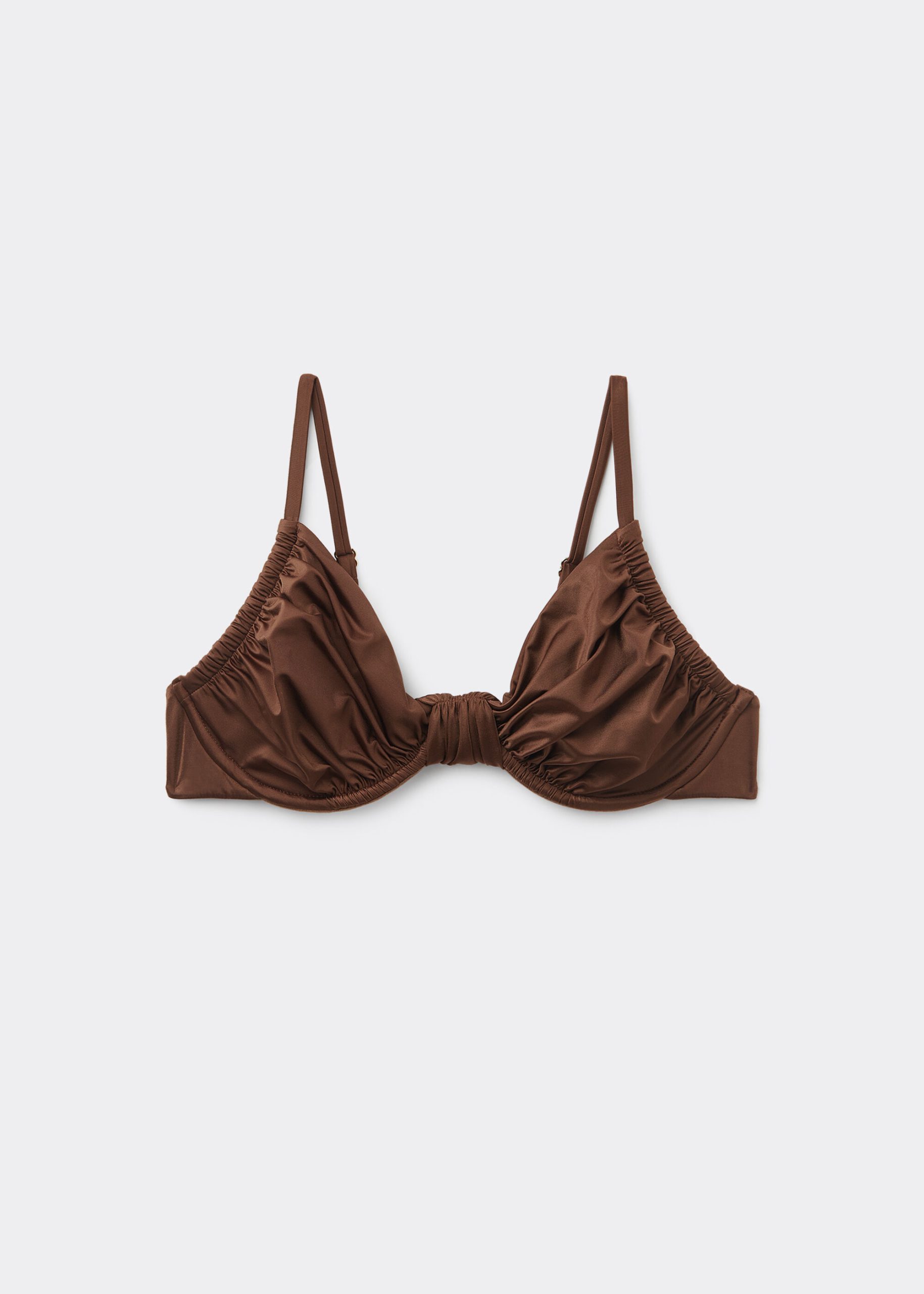 Unpadded balconette bikini top with underwire. The structure of the cups perfectly embrace and support the bust, thanks to the side drawstring on the cups that can also adjust the fit. Ideal for the larger bust. The style features a bright fabric with a silky effect, embellished by ruffles and gold tips. Adjustable straps and hook closure with two adjusters.