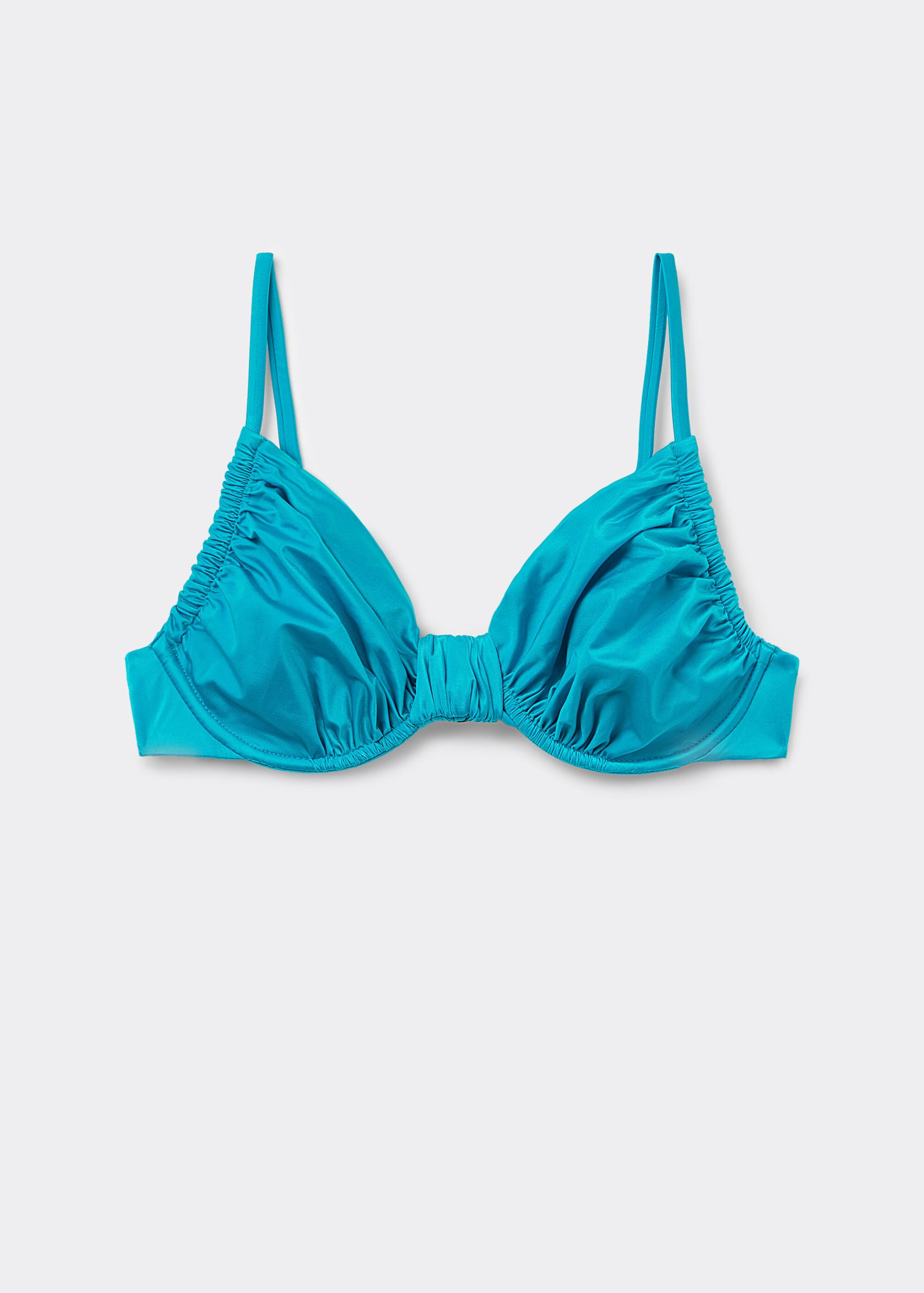 Unpadded balconette bikini top with underwire. The structure of the cups perfectly embrace and support the bust, thanks to the side drawstring on the cups that can also adjust the fit. Ideal for the larger bust. The style features a bright fabric with a silky effect, embellished by ruffles and gold tips. Adjustable straps and hook closure with two adjusters.