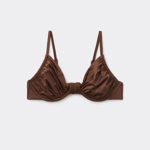 Unpadded balconette bikini top with underwire. The structure of the cups perfectly embrace and support the bust, thanks to the side drawstring on the cups that can also adjust the fit. Ideal for the larger bust. The style features a bright fabric with a silky effect, embellished by ruffles and gold tips. Adjustable straps and hook closure with two adjusters.