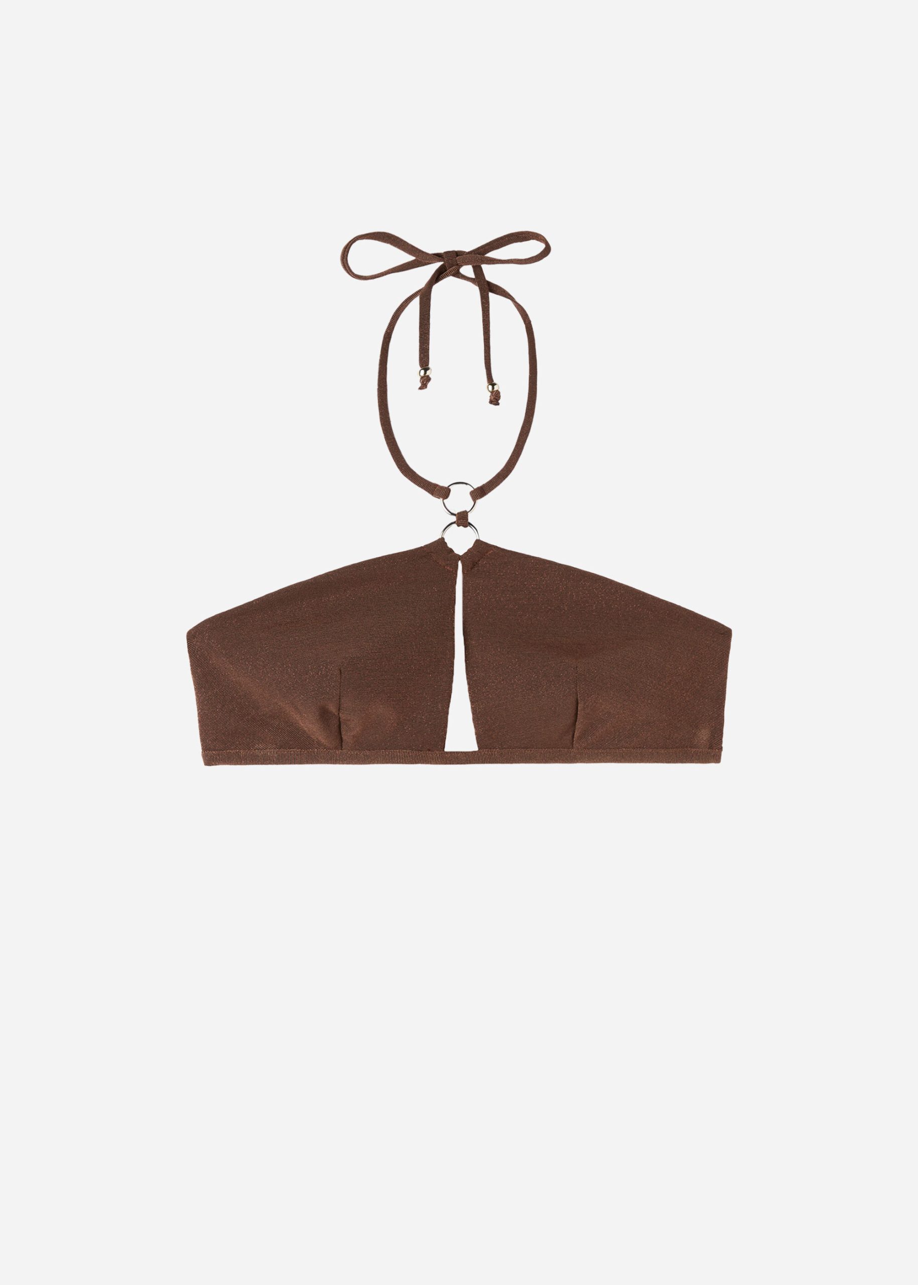Bandeau bikini top, wireless for a natural effect. The side boning helps support the bust. The style features a central opening and soft fabric with shiny lamé thread embellished with nickel free small gold rings. Back hook closure.