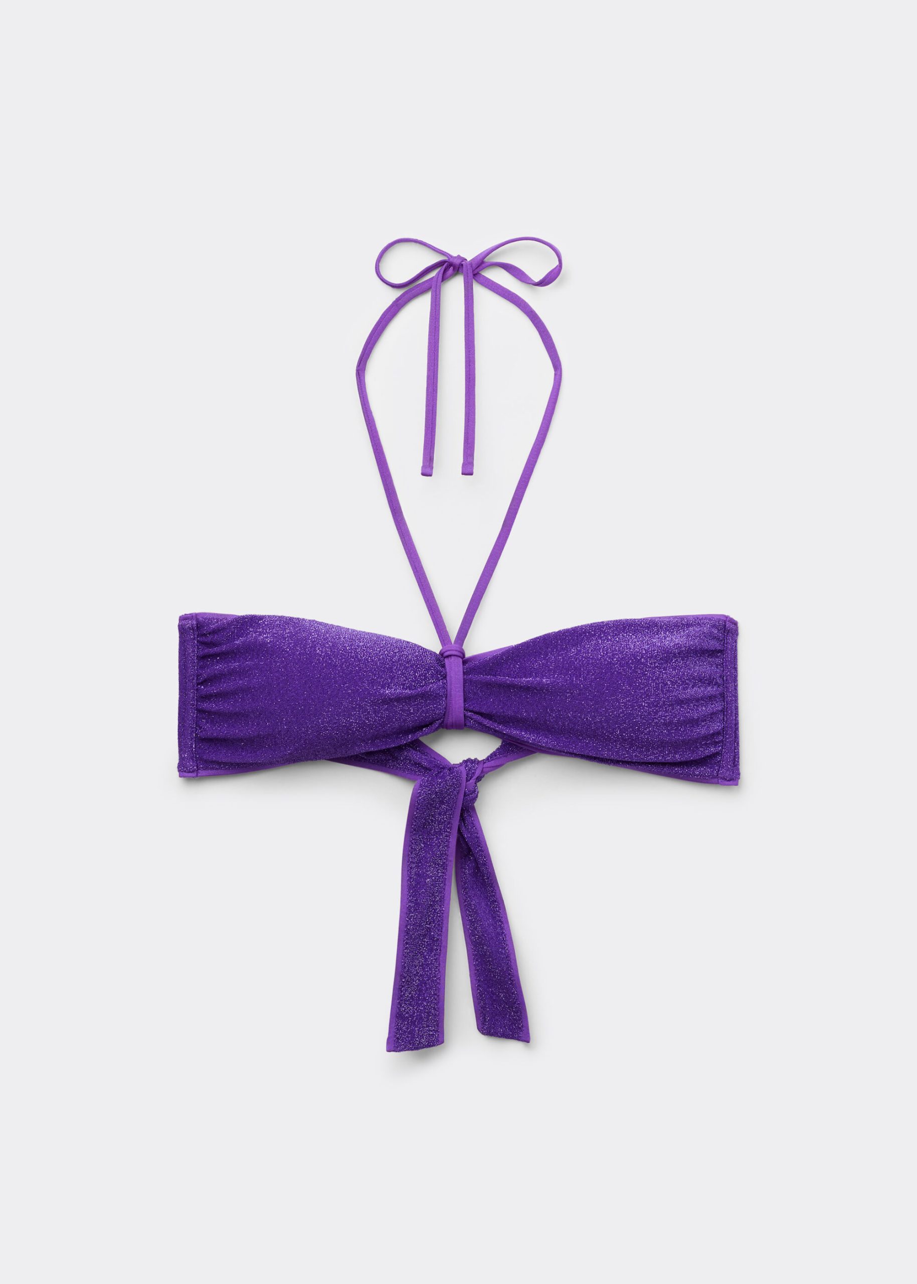 Wireless bandeau bikini top with removable padding, made in stylish shiny lamé fabric that provides a luminous and sophisticated effect. The side boning offers better support while the removable central strap lets you vary the top’s style and fit. Back tie closure.