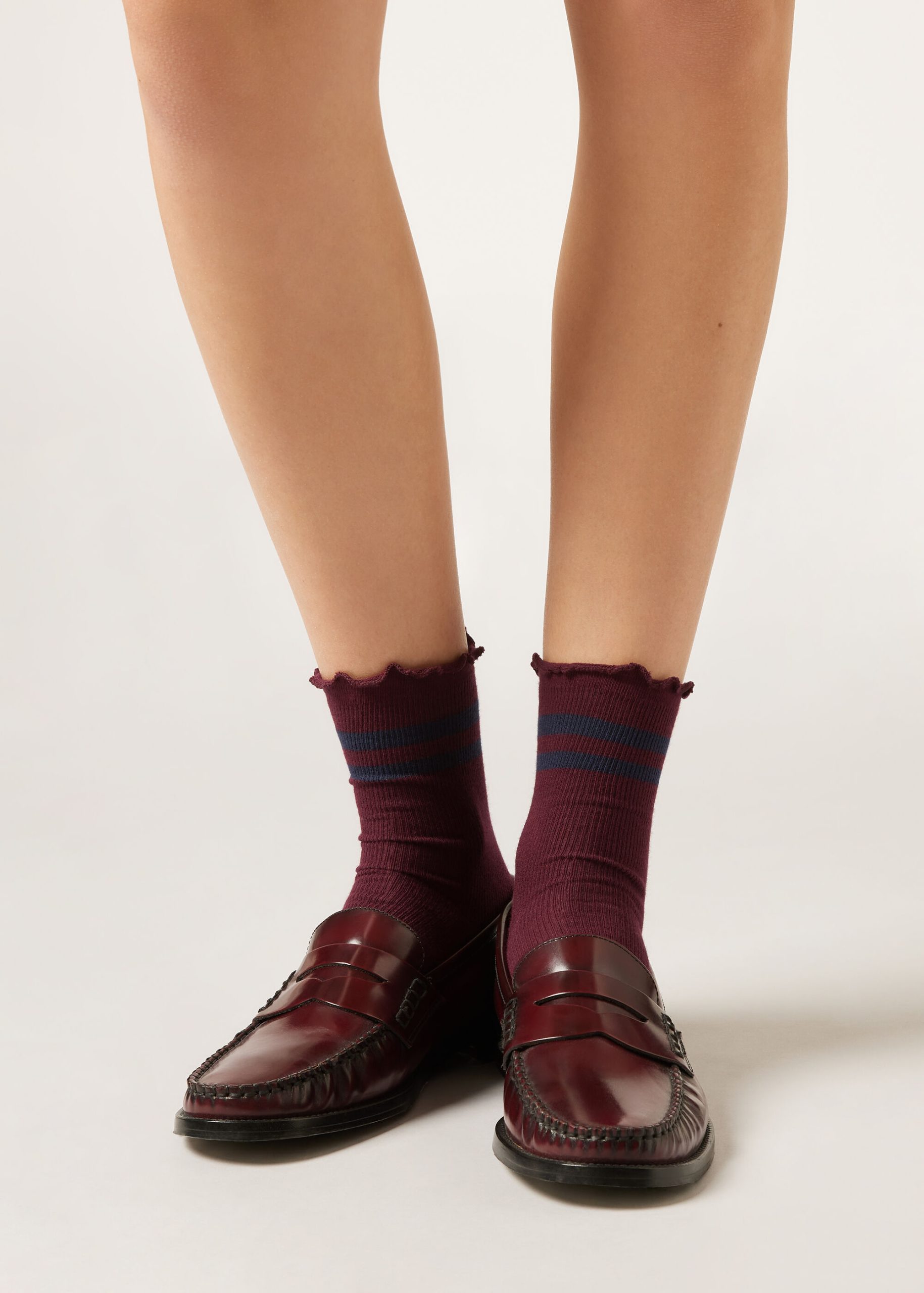 Women’s short socks in soft cotton. The micro-ribbing offers a refined touch and right amount of stretch. The romantic edge and contrasting color bands add a subtle and feminine originality.