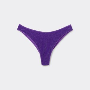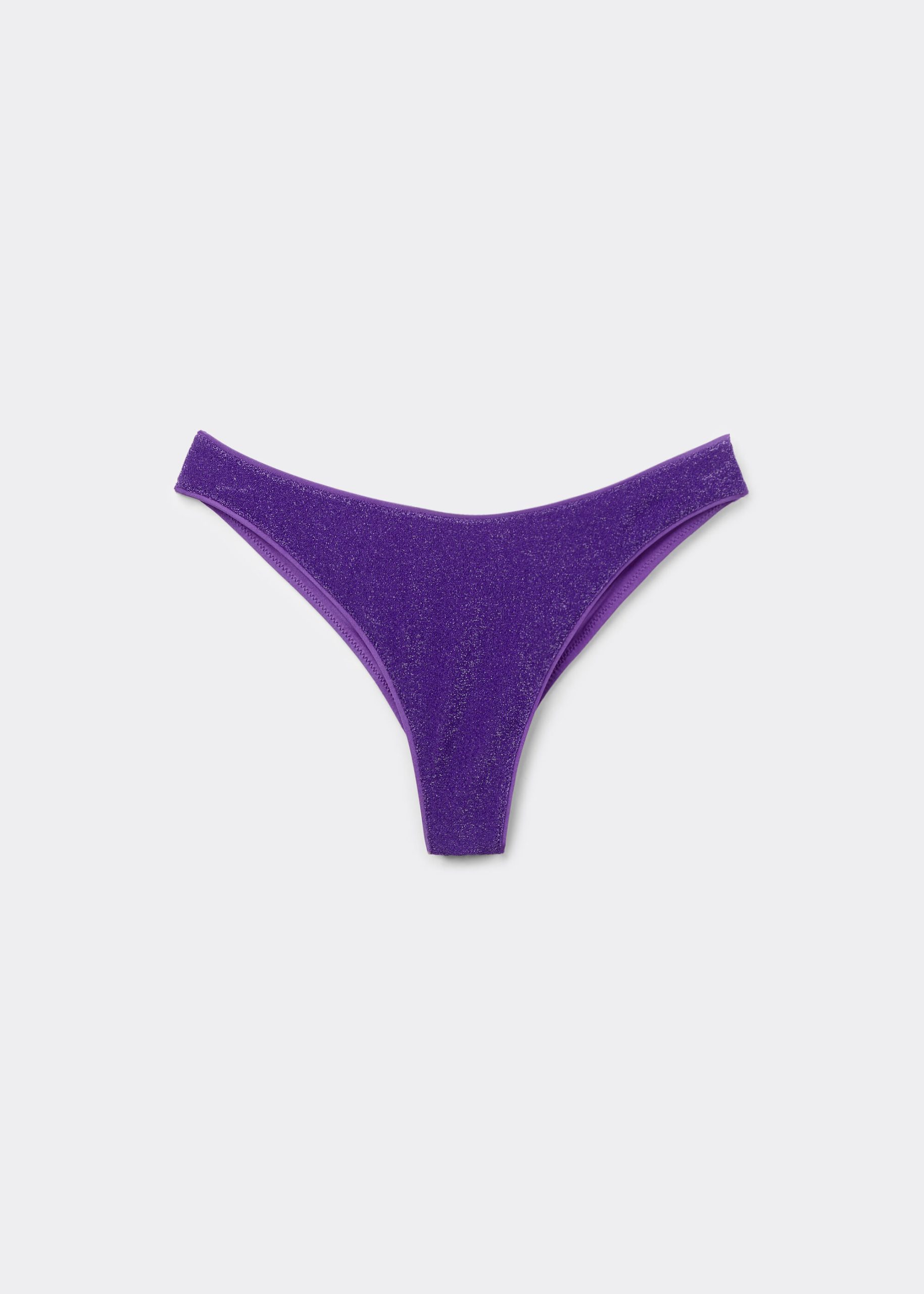 Fully lined Brazilian bikini bottoms. Made from refined shiny lamé fabric offering a bright and sophisticated effect. The slightly rounded waist at the front allows for wear with classic coverage or a higher leg, depending on your body shape.