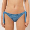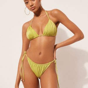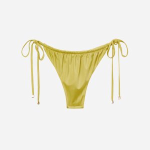 Brazilian cut bikini bottom with side ties to adjust the fit. The style features a bright fabric with a silky effect, embellished by ruffles and gold tips. Fully lined with invisible seams.