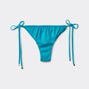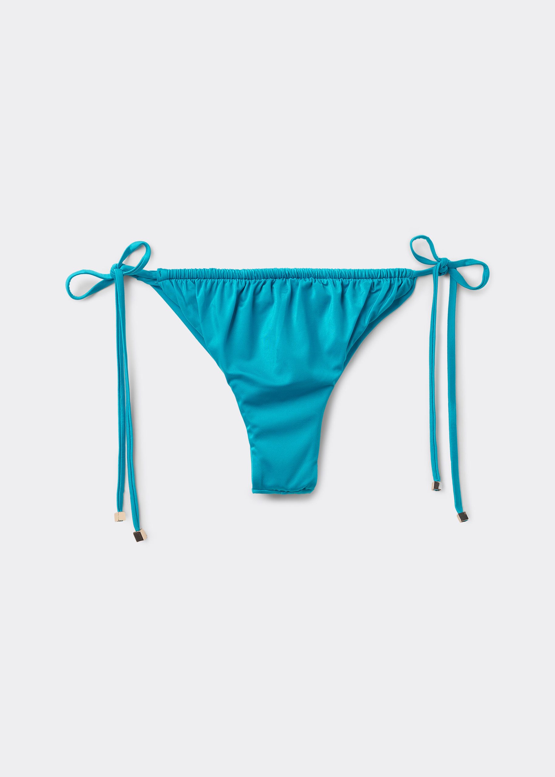 Brazilian cut bikini bottom with side ties to adjust the fit. The style features a bright fabric with a silky effect, embellished by ruffles and gold tips. Fully lined with invisible seams.