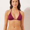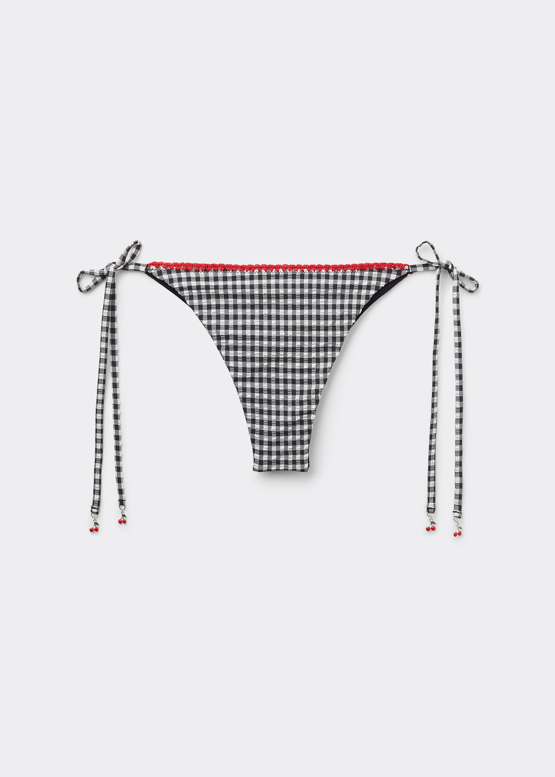 Brazilian cut bikini bottoms with side ties. Made from a vichy pattern fabric, it is enriched by a refined red trim. The slightly rounded waist at the front allows for both a classic or more high-cut fit, depending on one’s physique. Fully lined with invisible seams.
