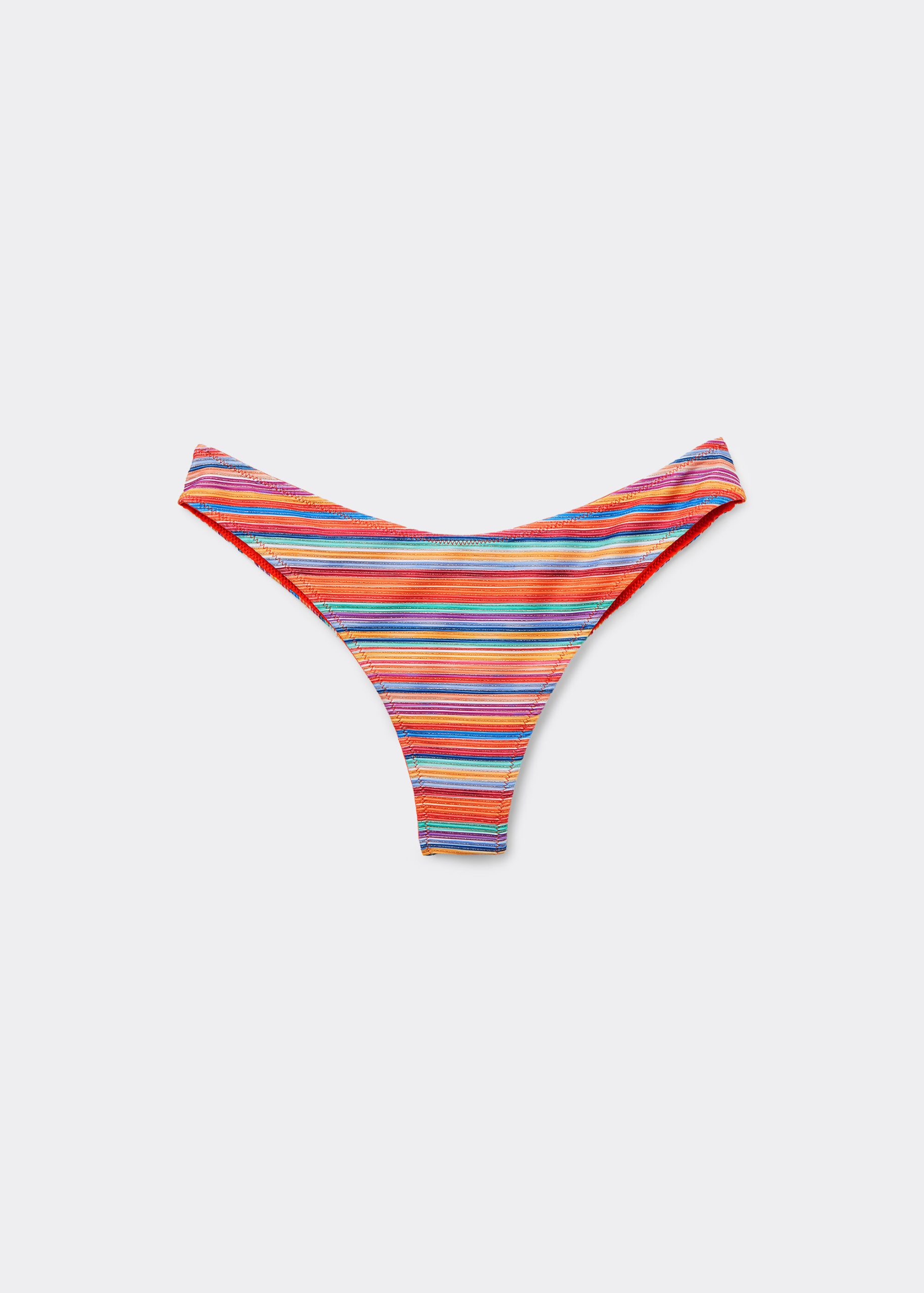 Brazilian bikini bottoms with invisible seams. The slightly rounded waist at the front allows for both a regular and more high-cut fit, depending on one’s physique. Striped patterned fabric in bright colors enhanced with sparkling glitter, creating a dynamic and contemporary effect with its soft texture and vibrant look.
