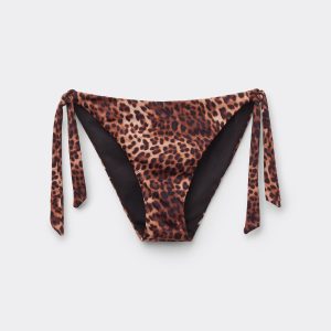 Bikini bottoms with bow closure on the sides for an adjustable fit. The style features an elegant animalier pattern. The slightly rounded waistline allows it to be worn both regularly and with a higher leg, enhancing the physique. Fully lined with invisible seams.
