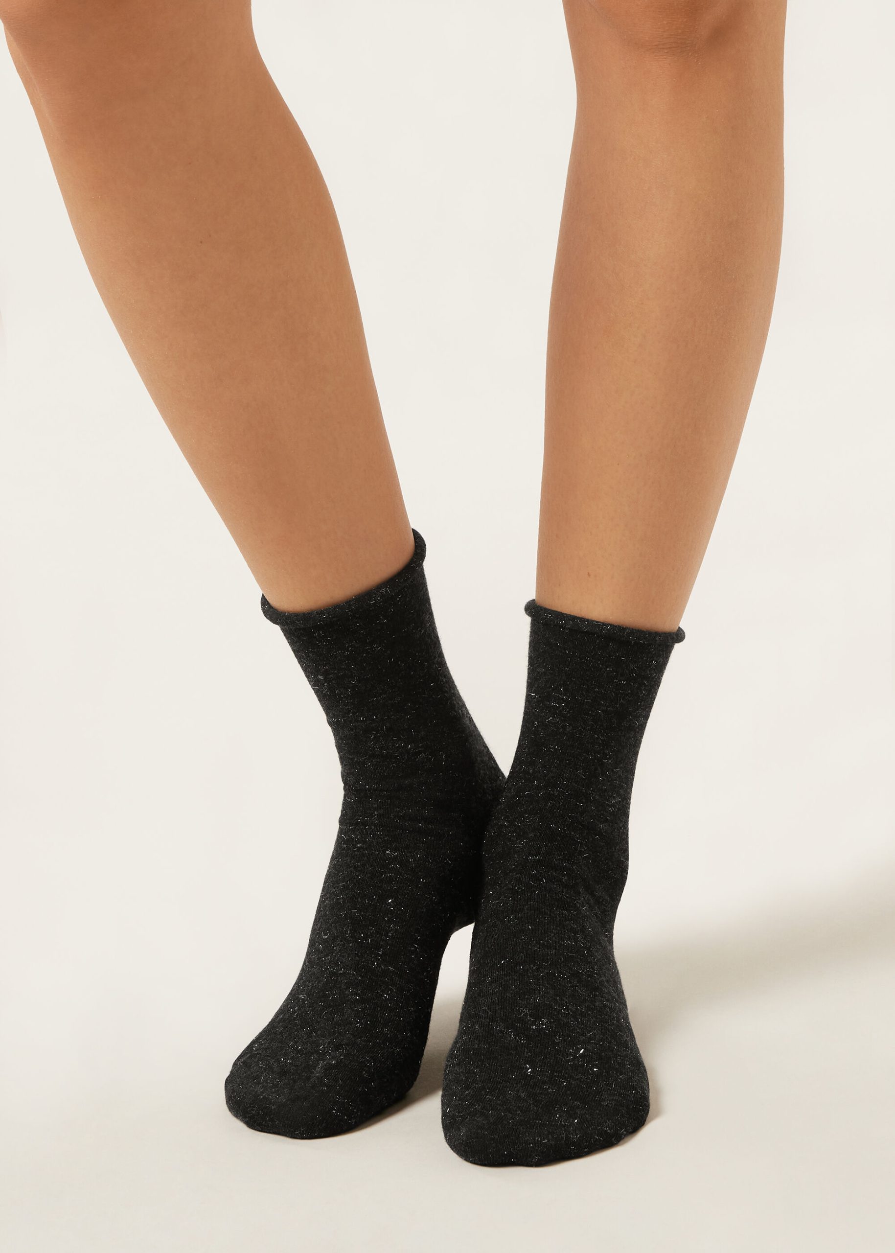Women’s non-elastic short socks in soft cashmere with comfort trim embellished with glitter. Perfect for total comfort without sacrificing style, they offer a luxurious and warm feeling ideal for winter, adding a touch of elegance to your everyday wardrobe.