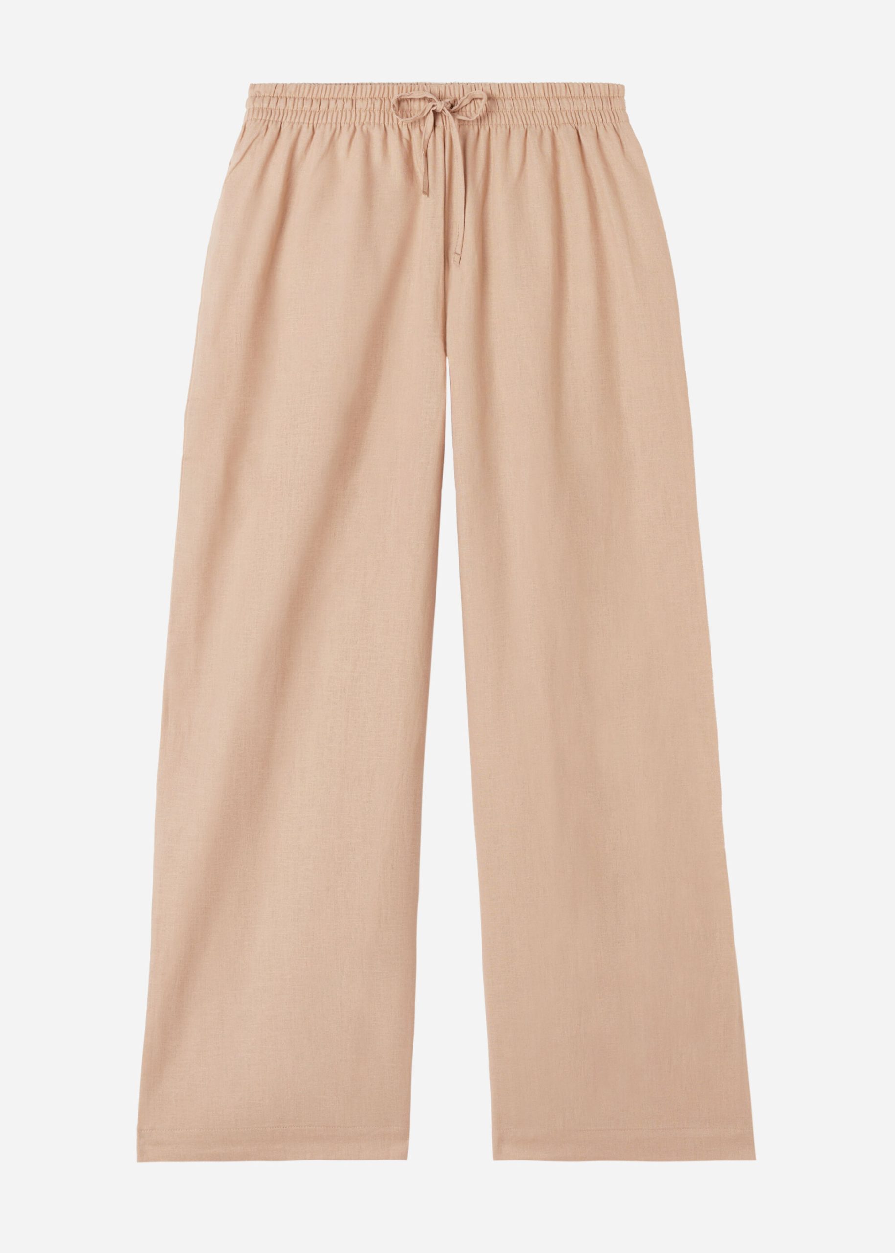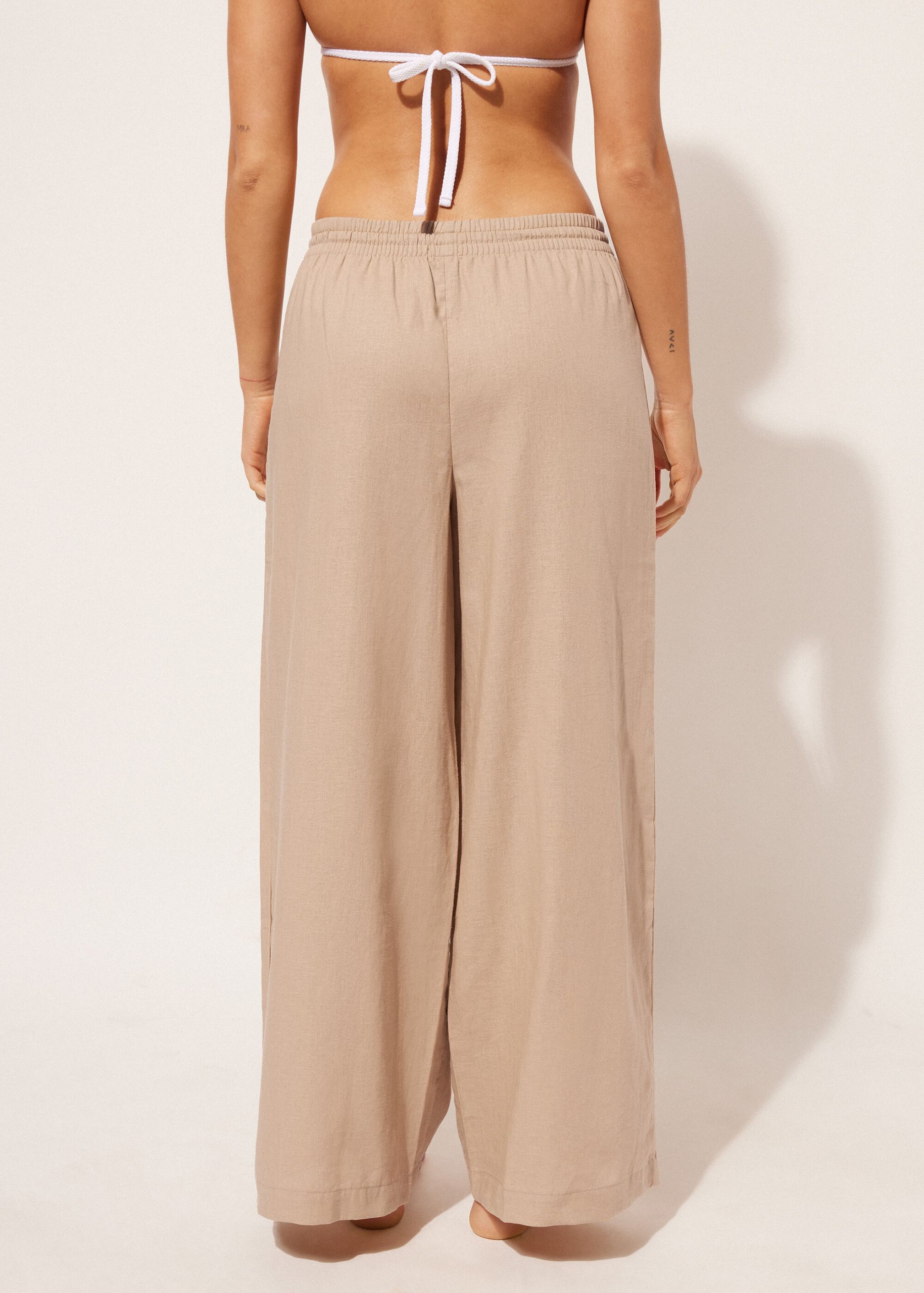 Cotton and linen pants with comfortable drawstring at the waistband. Palazzo style. Available in different colors that match the beachwear collection.