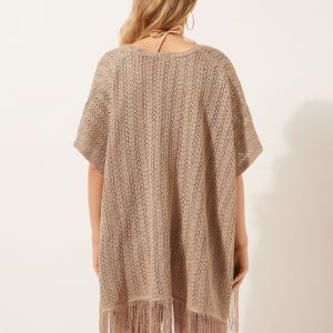 Short-sleeve vest crocheted in refined golden lamè, featuring large armholes and open design on the front. The hem is enriched by elegant fringe that adds movement and a chic touch. The above-the-knee length makes it perfect for completing sophisticated and versatile outfits.