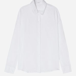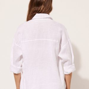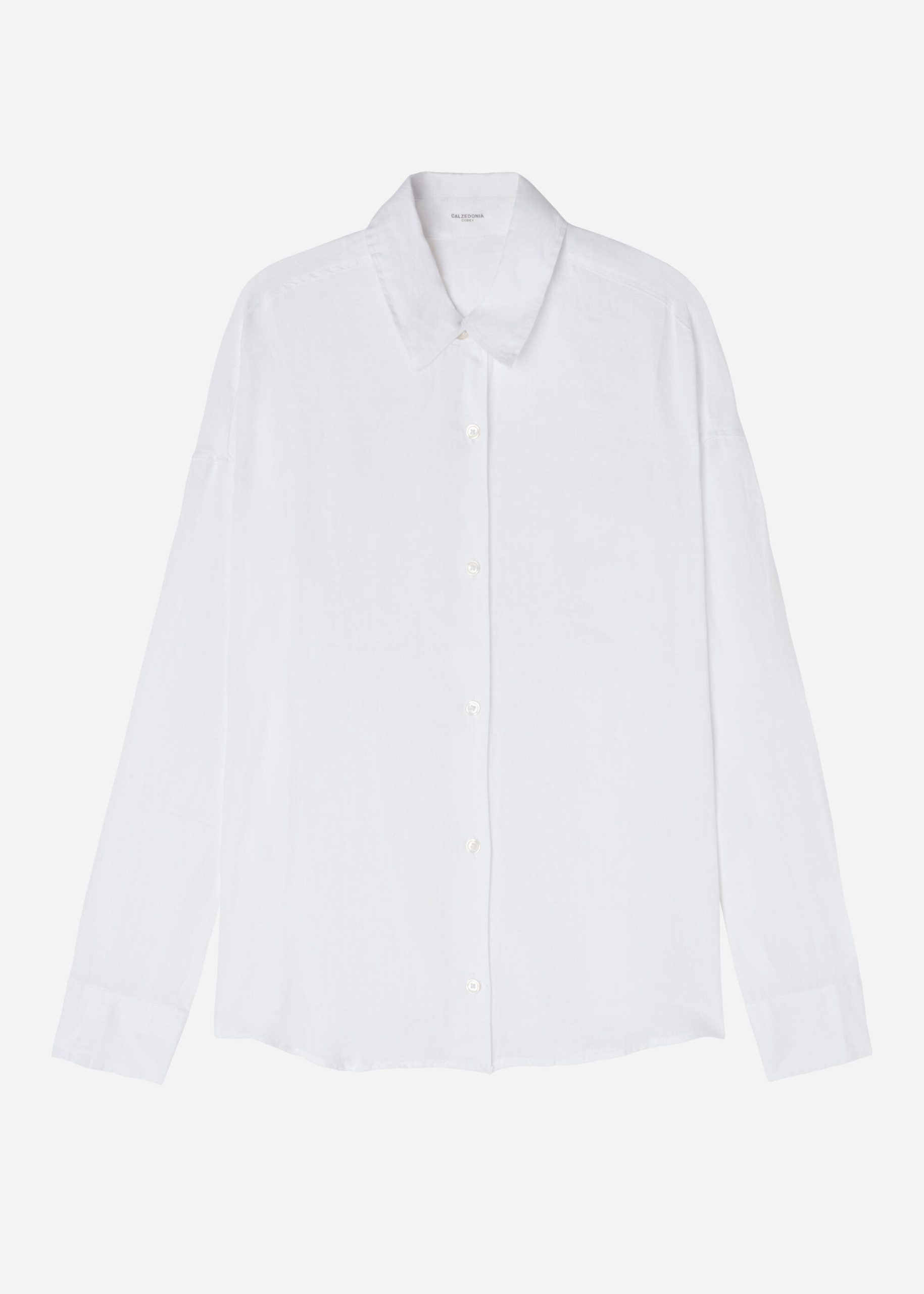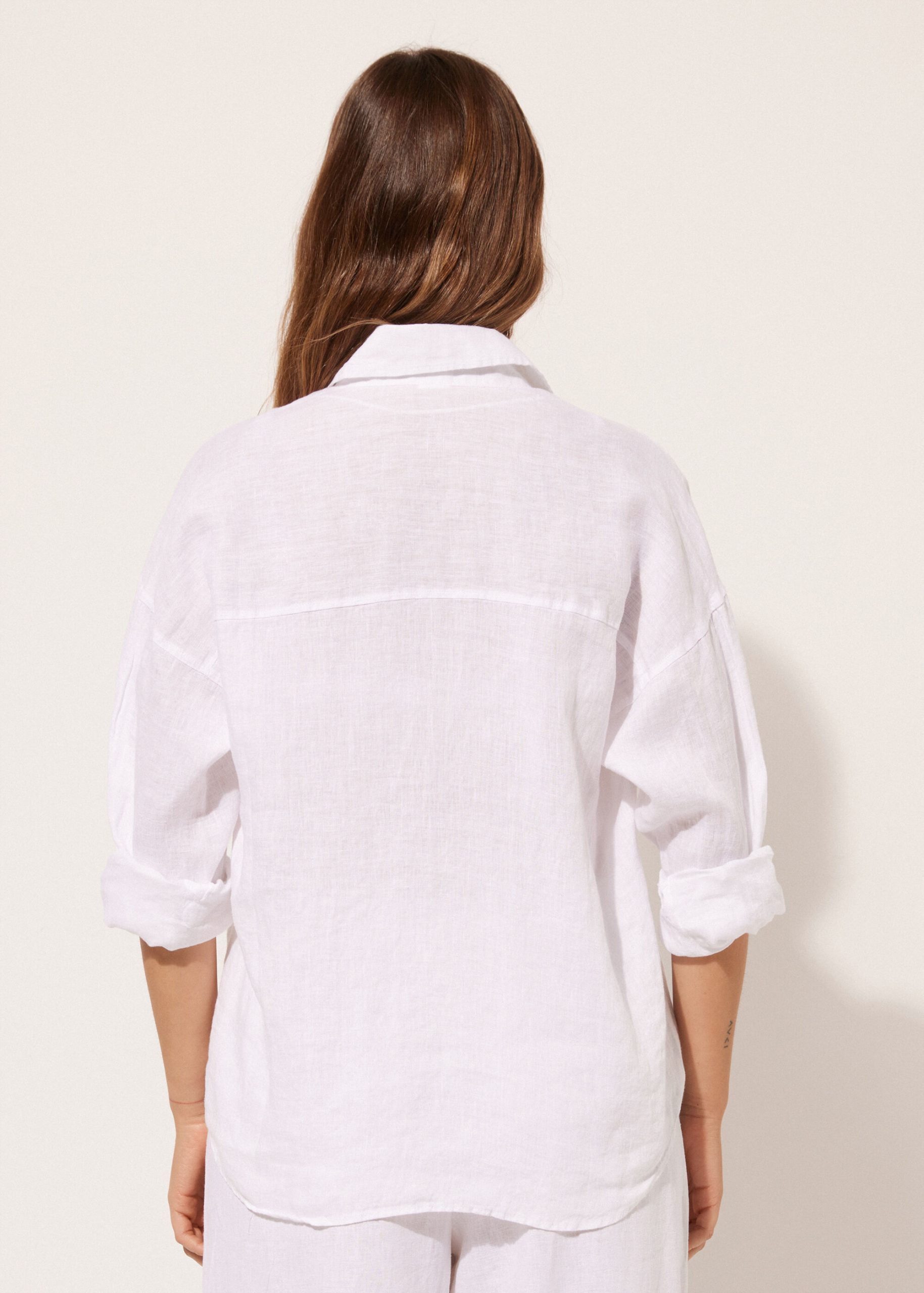 Cropped button-down shirt in linen, perfect for those who love natural fibers, with shirt collar and long sleeves.