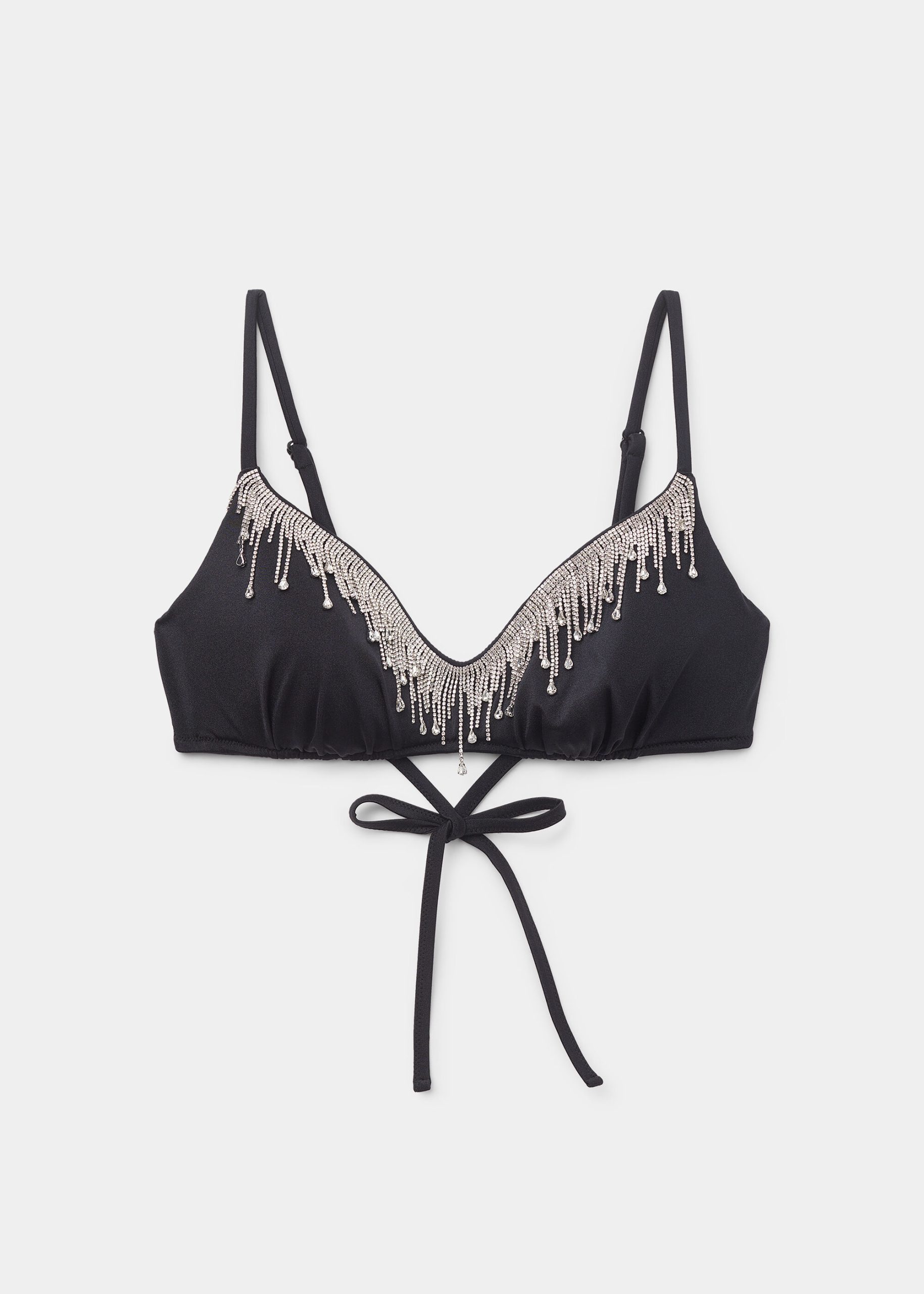 Wireless sleeveless top with light internal padding. The side stays help support the bust. Adjustable shoulder straps and slender lace fastening at the back. Shine in style in this exclusive top embellished with a cascade of crystals and silver gemstones. The perfect top to pair with your glamorous evening outfits. PLEASE NOTE: this garment has been hand embellished. Each garment is unique. Due to the delicate nature of this garment, please take care when washing.