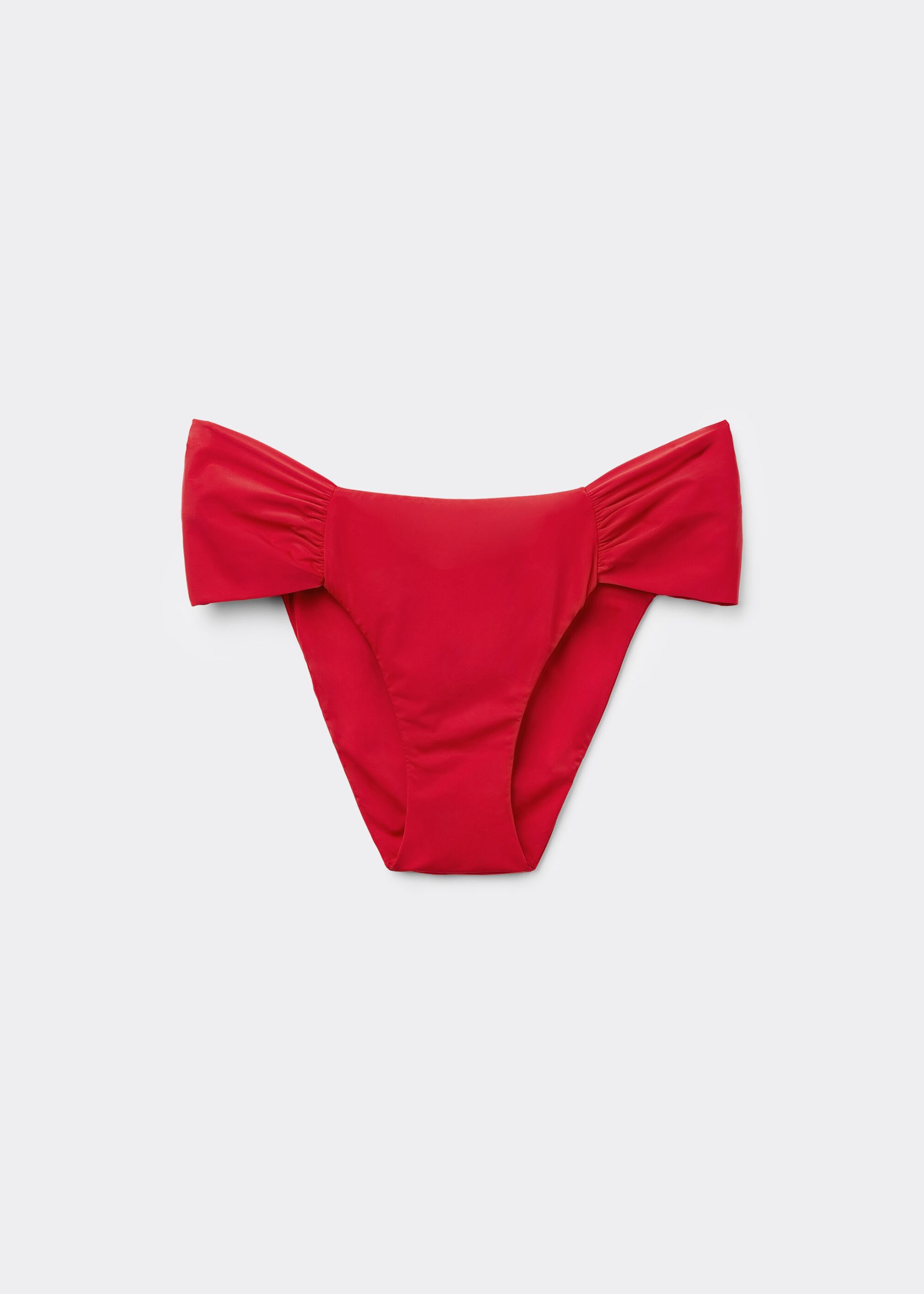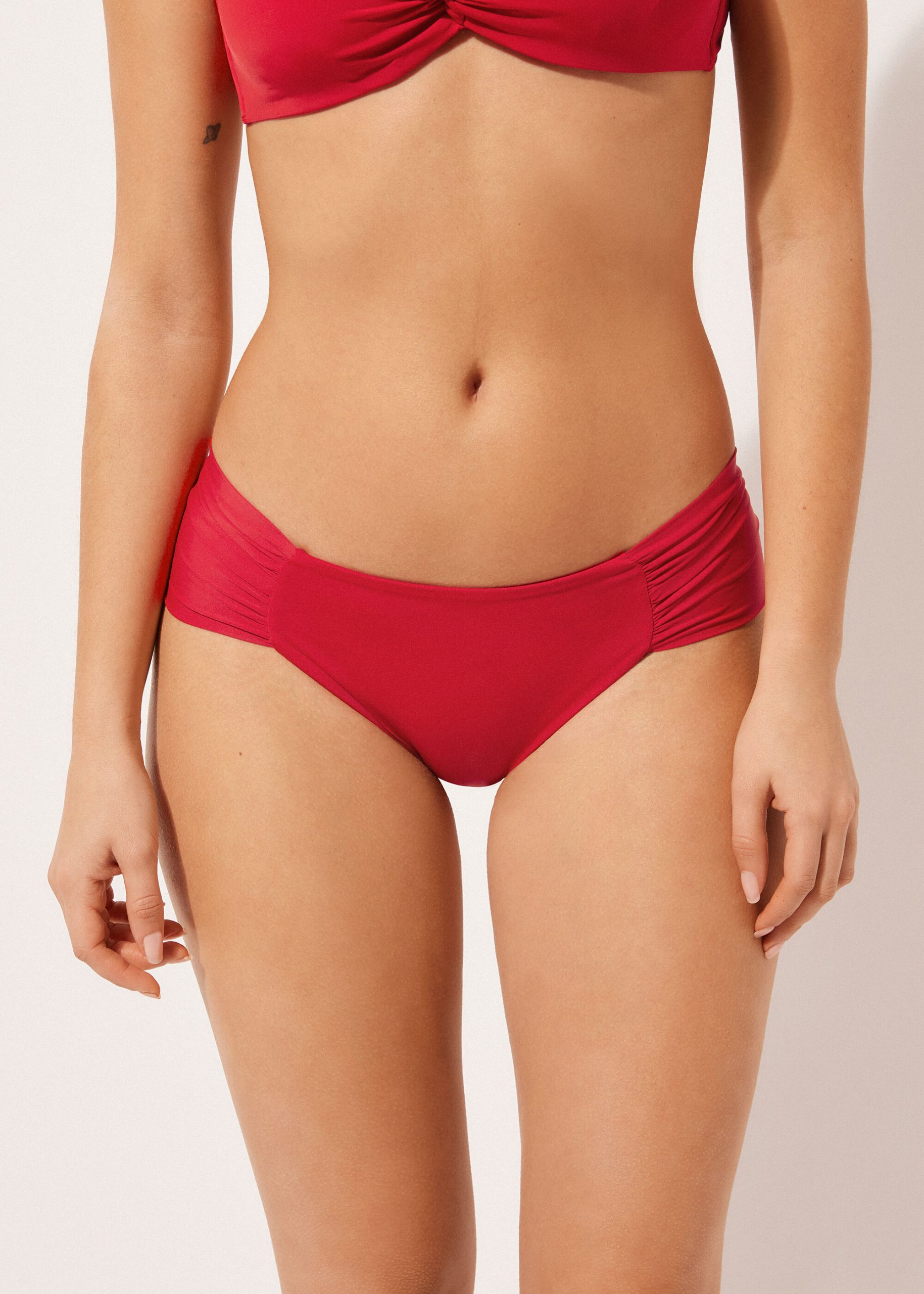 Bikini bottom with draped fabric at the sides that allows the height to be adjusted. The extremely soft fabric makes it pleasant to wear, offering a light and comfortable feel on the skin. Fully lined with invisible seams.
