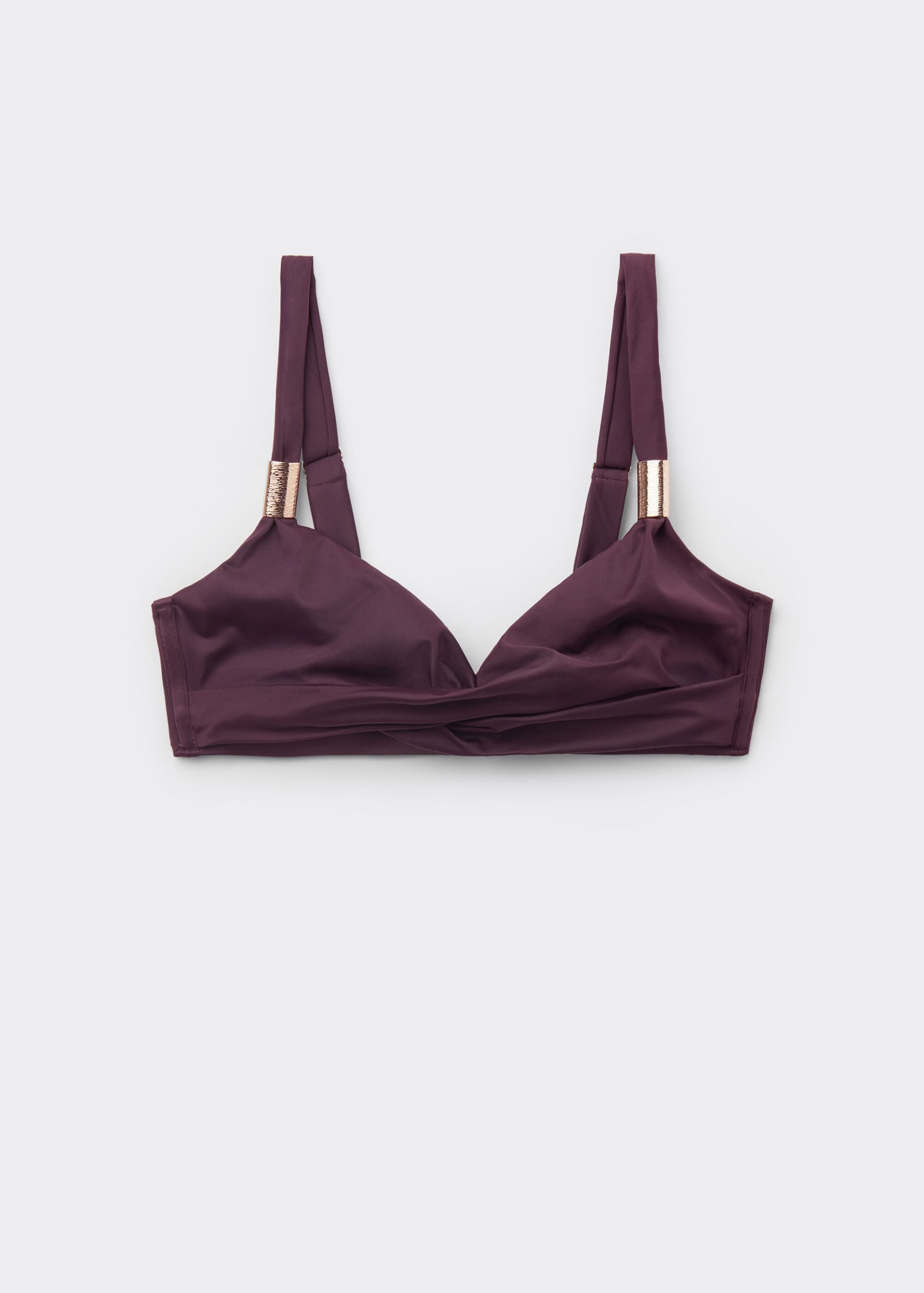 Triangle style bikini top, wireless and unpadded for a natural effect. The structure of the cups and the wide fit at the sides provide good support for larger busts. The compact fabric, designed to exalt and enhance the body’s curves, ensures excellent support and is studied to make every woman feel at ease without constraint. The center gore features draping in the middle and golden accessories that exalt its elegance. Adjustable shoulder straps. Back closure with two hook-and-eye closures to improve the fit of the underband.