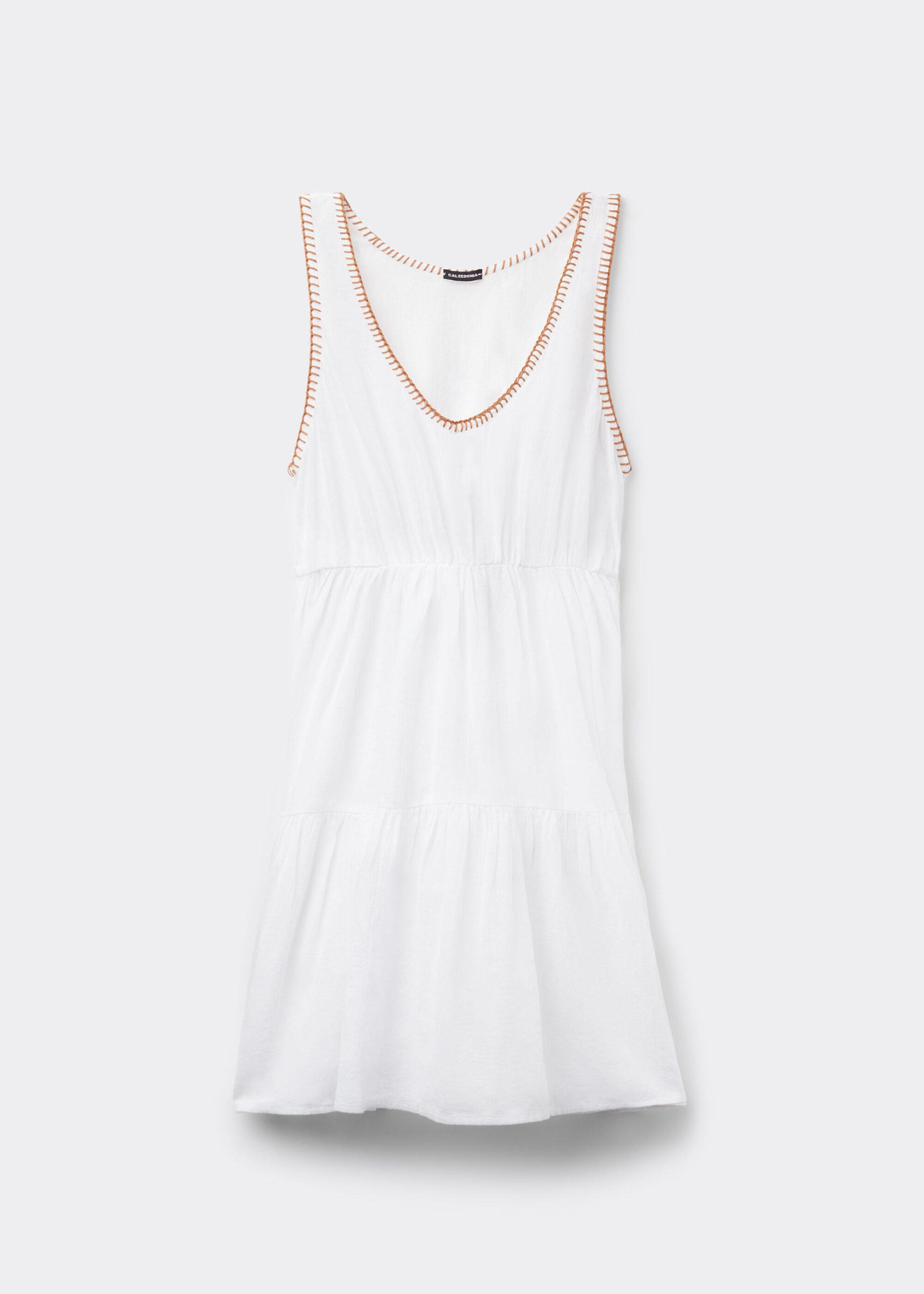 Sleeveless mini dress with embroidered V-neckline and ruffled skirt. Elegant and feminine, ideal for fresh and sophisticated looks. Perfect for every summer event.