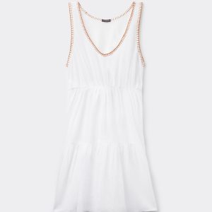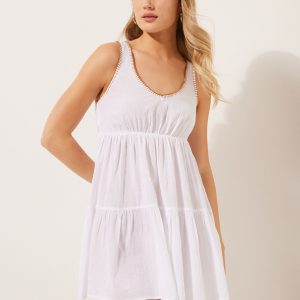 Sleeveless mini dress with embroidered V-neckline and ruffled skirt. Elegant and feminine, ideal for fresh and sophisticated looks. Perfect for every summer event.