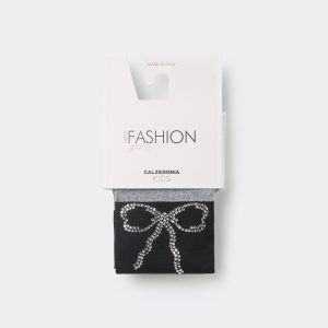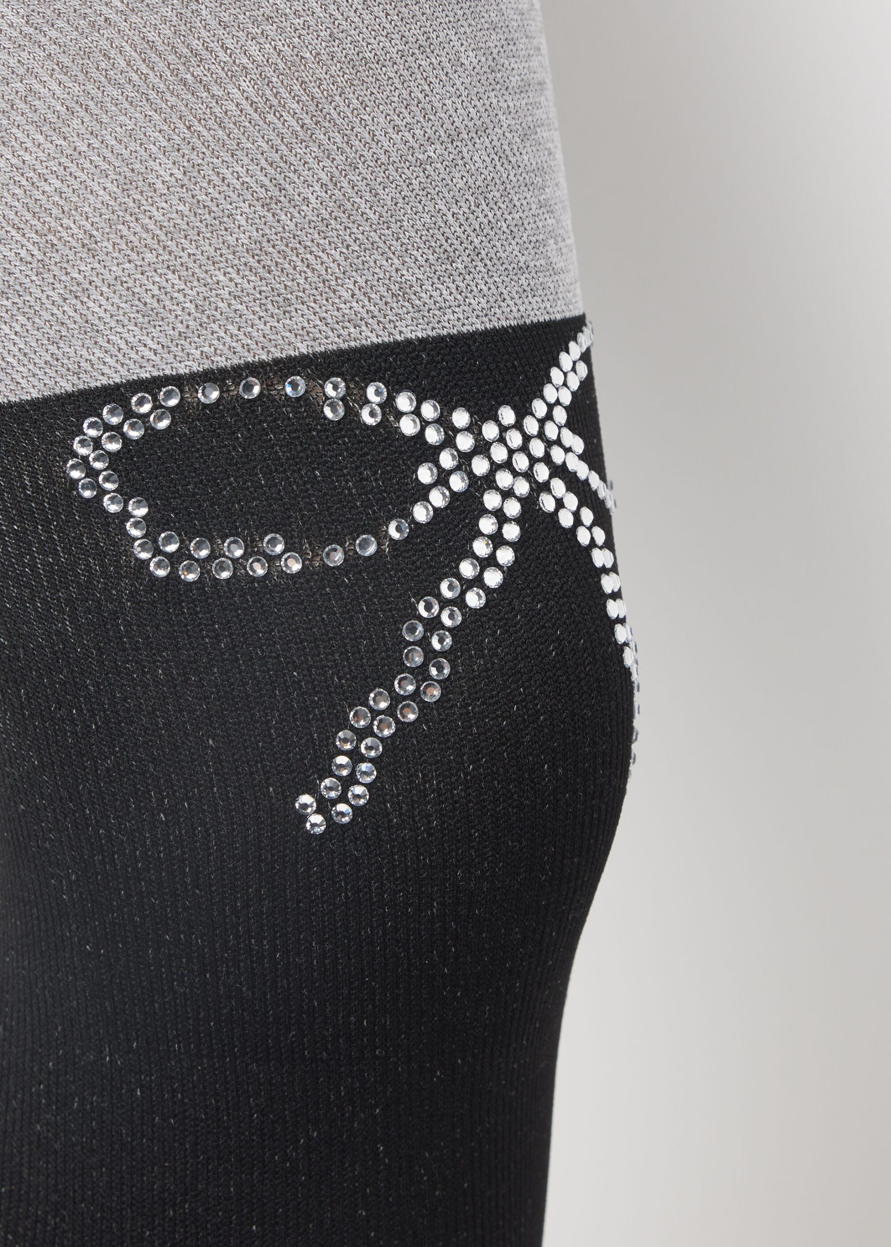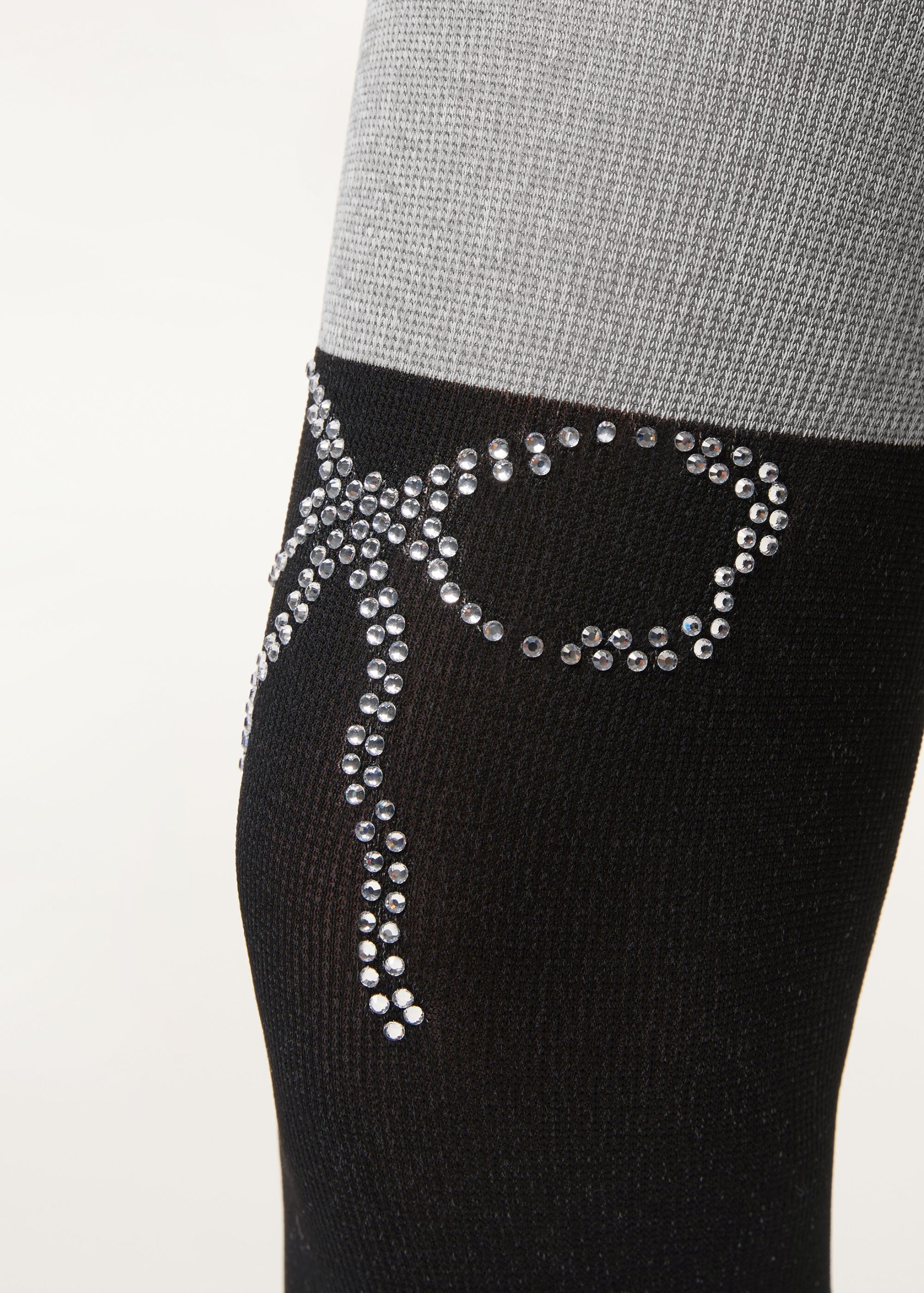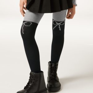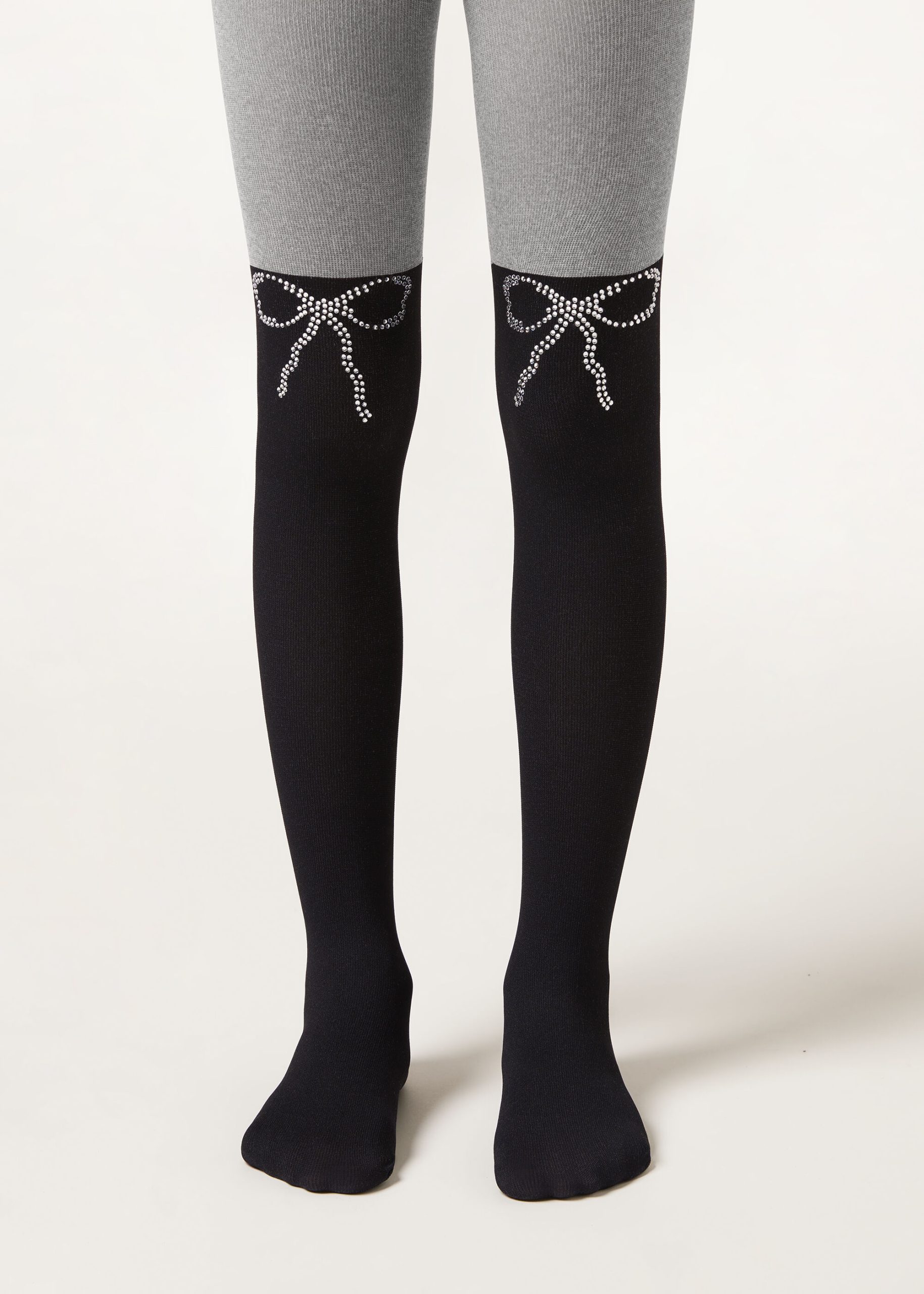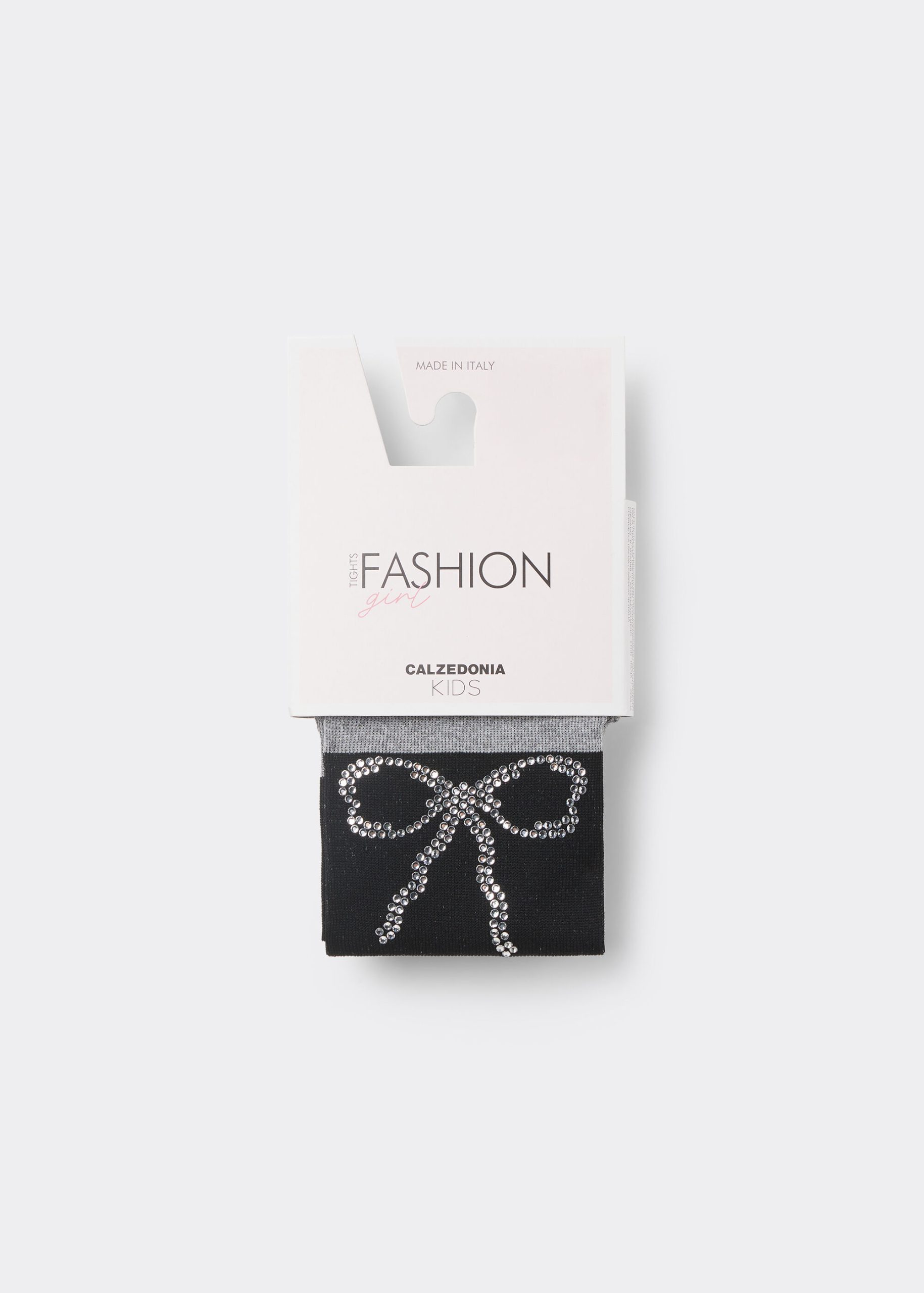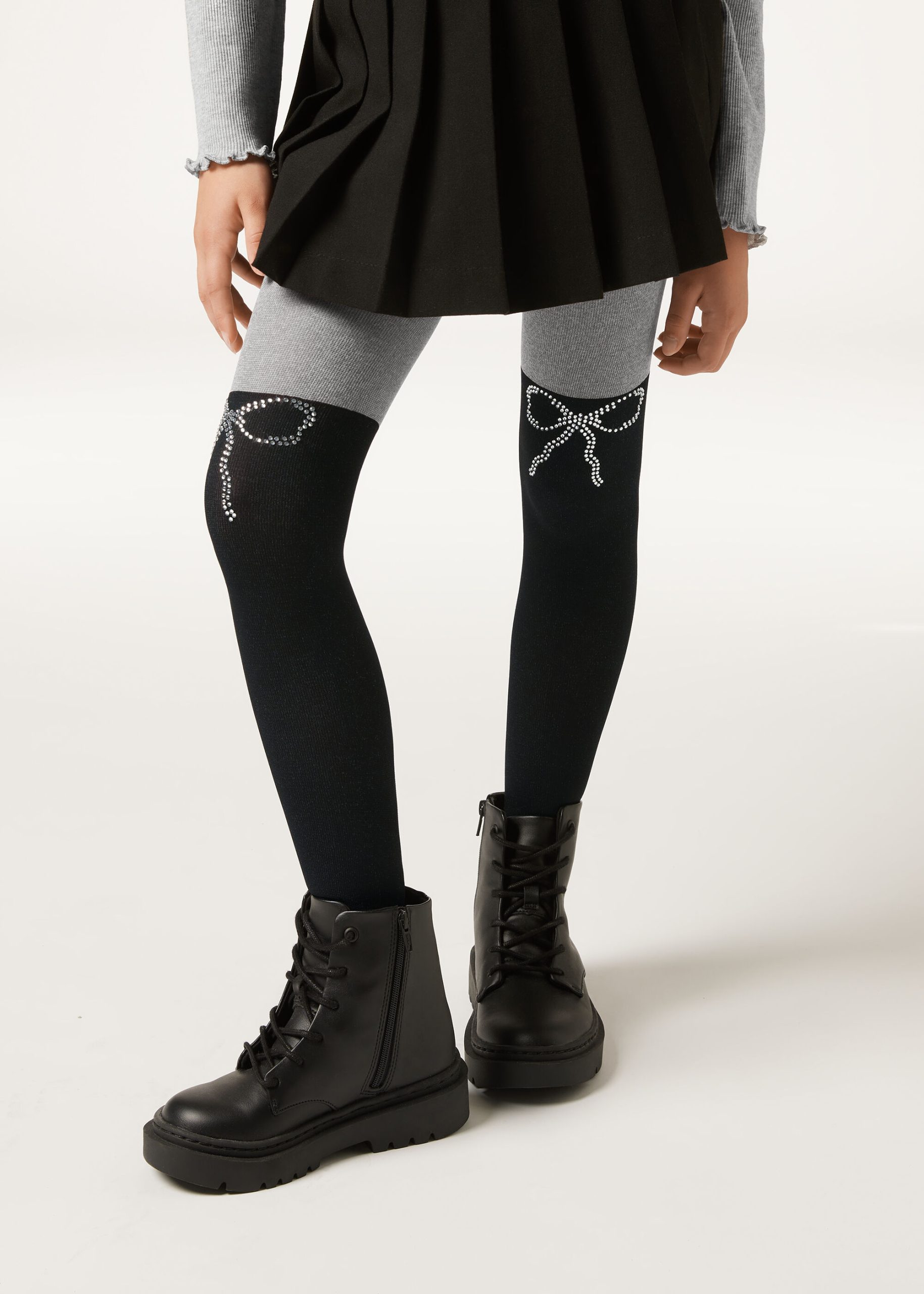 Girls’ tights in 80 denier microfiber with a heathered longuette effect, embellished with a bow with rhinestone appliqué. Soft, opaque and perfect for elegant looks.