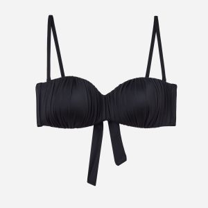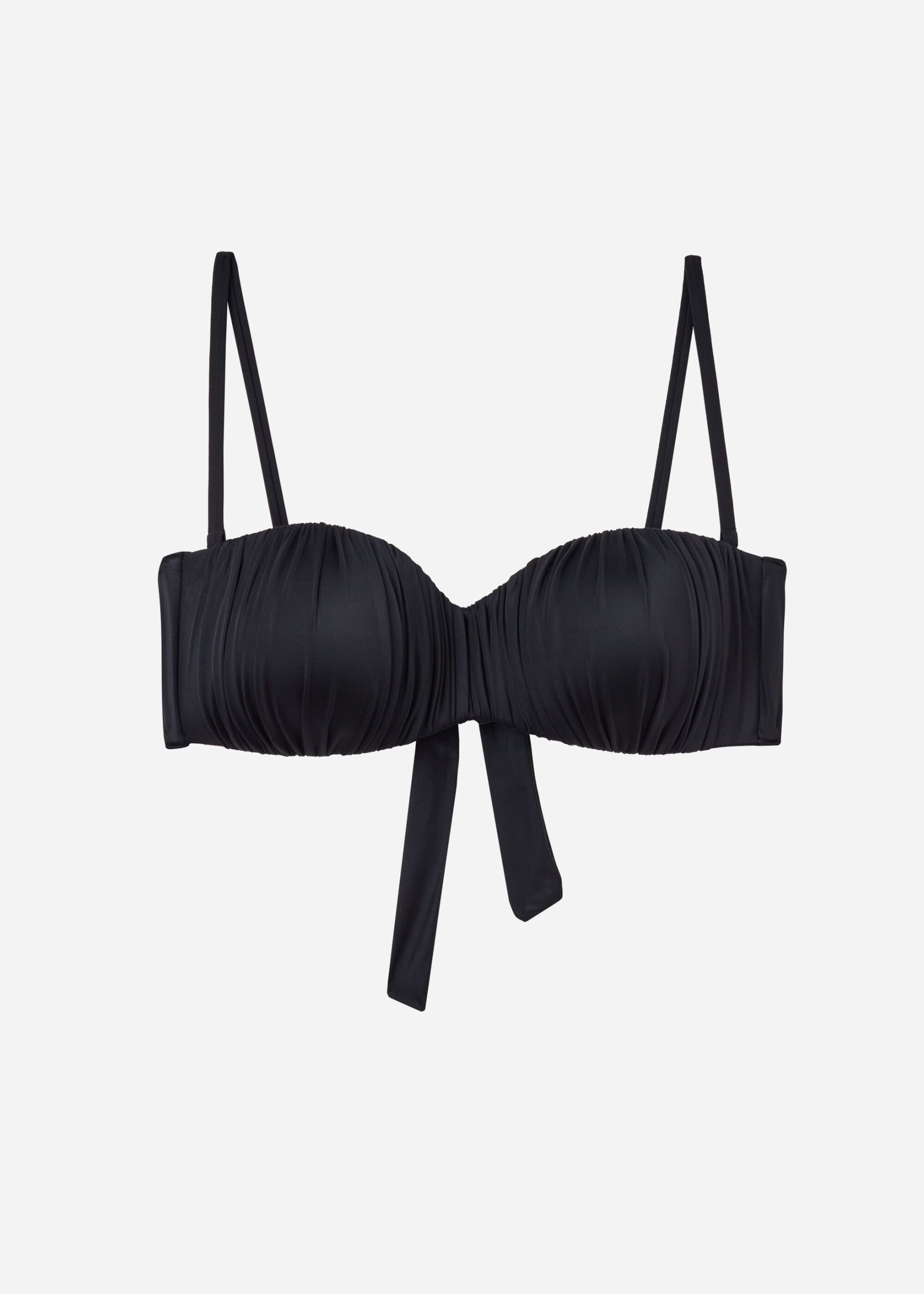 Bandeau bikini top with underwire, graduated padding cups, and side boning to guarantee good support, perfect for those with larger busts. The style features a bright fabric with a silky effect with ruffles. Adjustable and removable straps. Back tie closure.