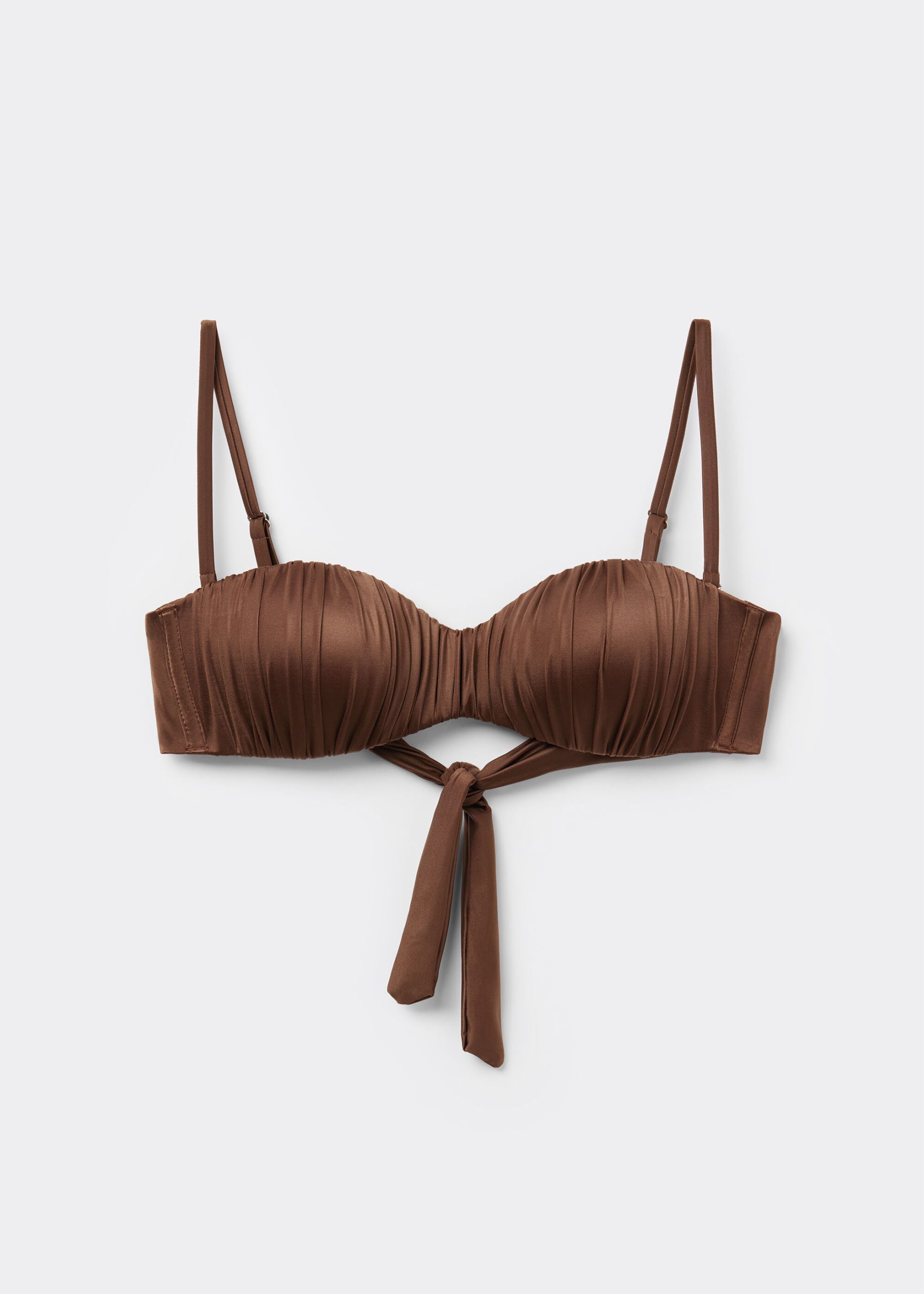 Bandeau bikini top with underwire, graduated padding cups, and side boning to guarantee good support, perfect for those with larger busts. The style features a bright fabric with a silky effect with ruffles. Adjustable and removable straps. Back tie closure.