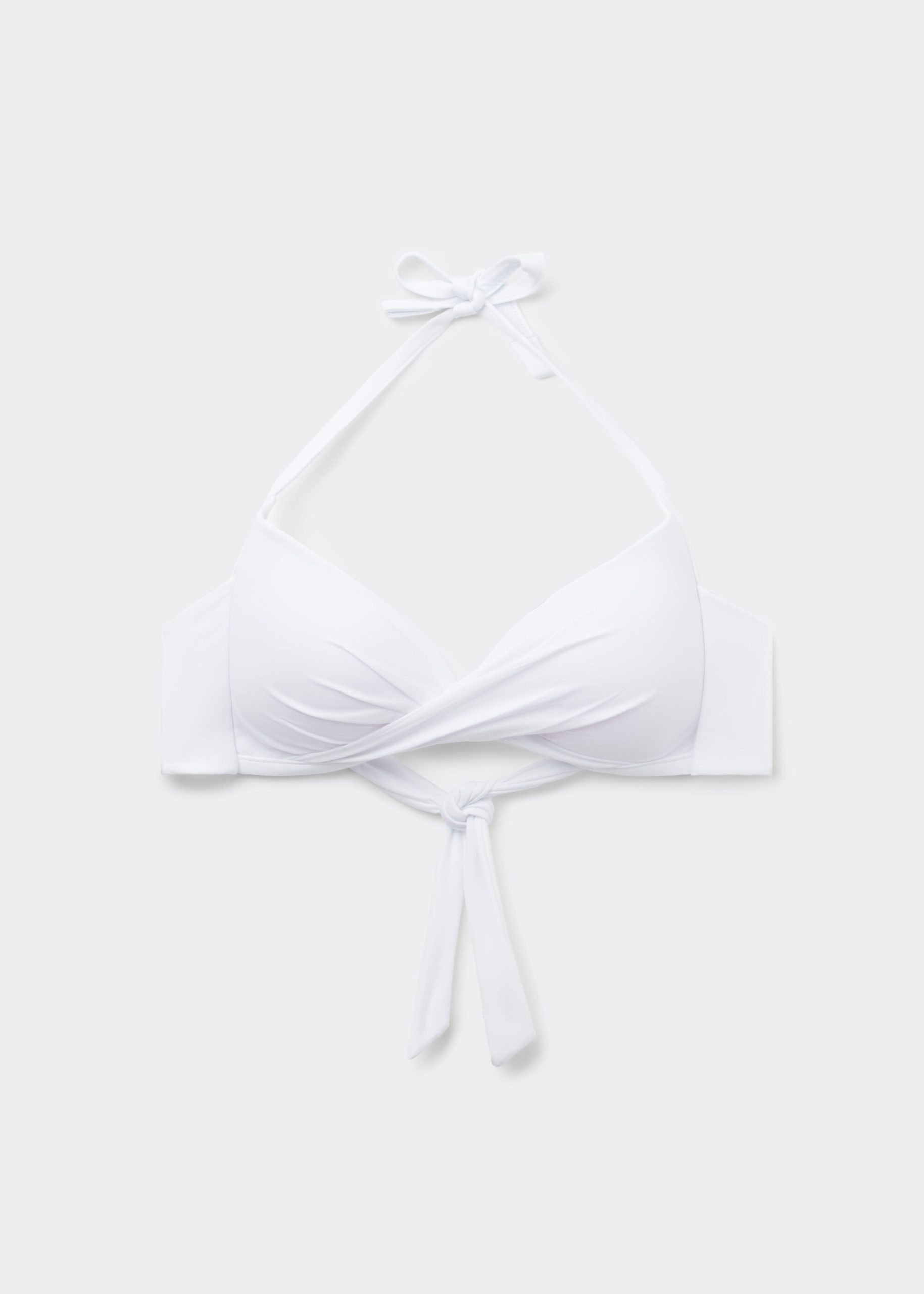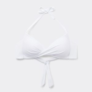This criss-cross swimsuit top features a fixed triangle shape with graduated padding in the cups, adding subtle volume to enhance your natural curves. The criss-cross detail at the neckline not only adds a trendy touch but also creates a flattering, sculpted effect. Plus, you can customize the fit further with the back tie closure which ensures a secure fit contoured to your body and shape. The soft, breathable fabric feels luxurious against the skin, ensuring comfort for hours, whether you’re lounging or swimming. Designed with versatility in mind, the adjustable shoulder straps feature eyelets, allowing you to either hook them to the back band for a classic fit or tie them behind the neck for a chic crossover bikini top look. The lightly padded cups in size XL/40 provide extra comfort and support, making this bikini top ideal for both style and function. Perfect for pairing with your favorite swim bottoms, the crossover bikini top is a must-have for your swimwear collection if you’re looking for subtle wrap over style.