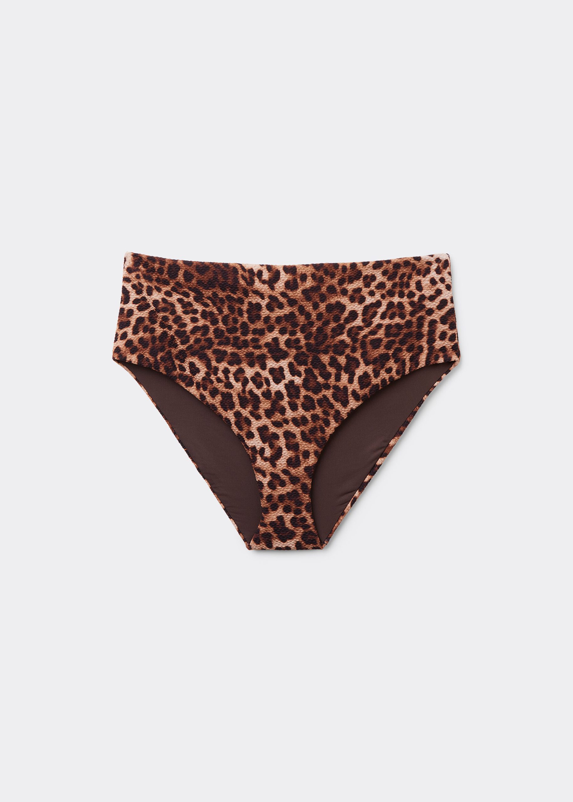 Bikini bottom with a high waist with a shaping effect on the abdomen, guaranteed by a special tulle at the front. The style features an elegant animal pattern and lightly ruched fabric. Fully lined with invisible seams.
