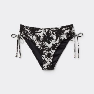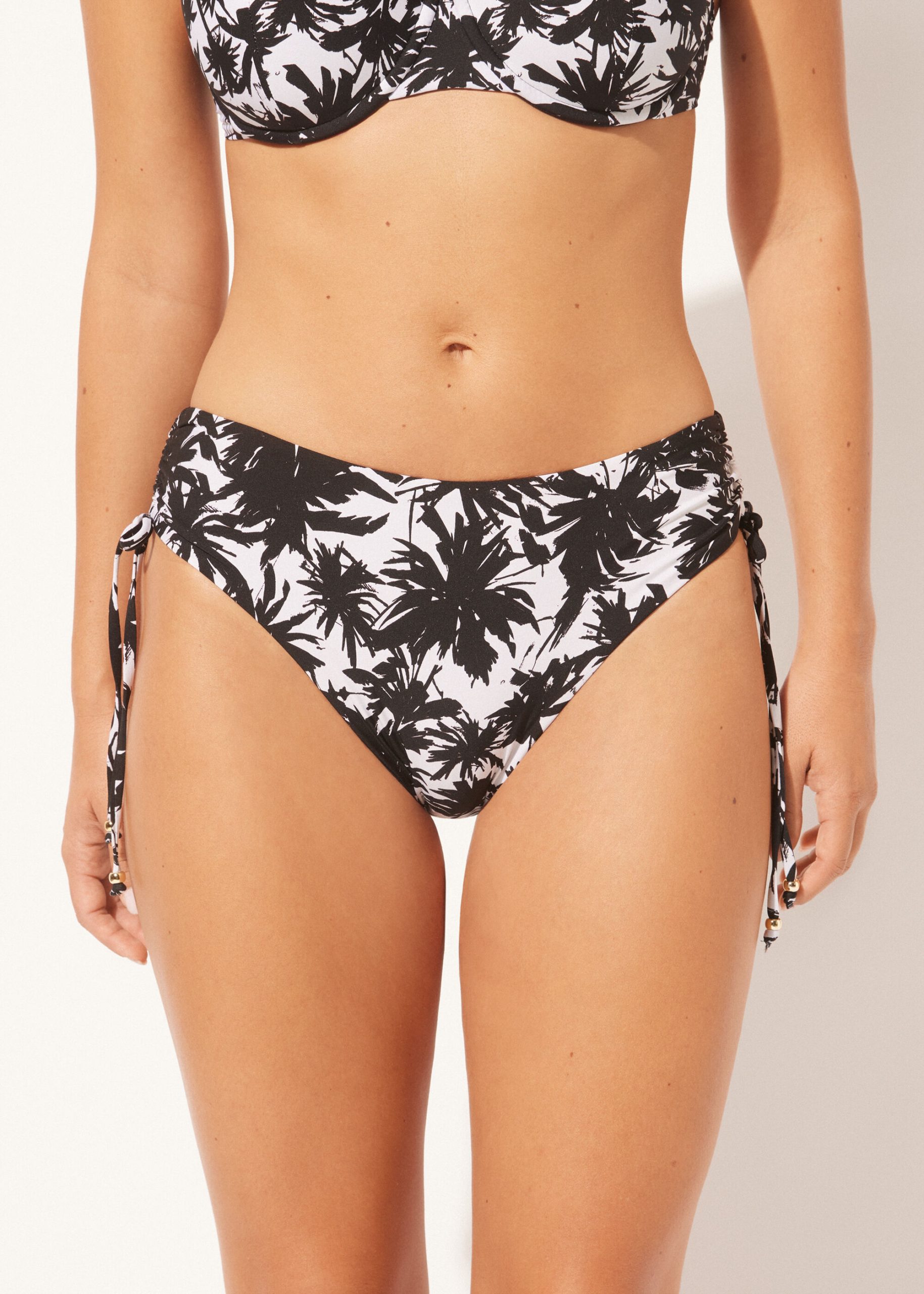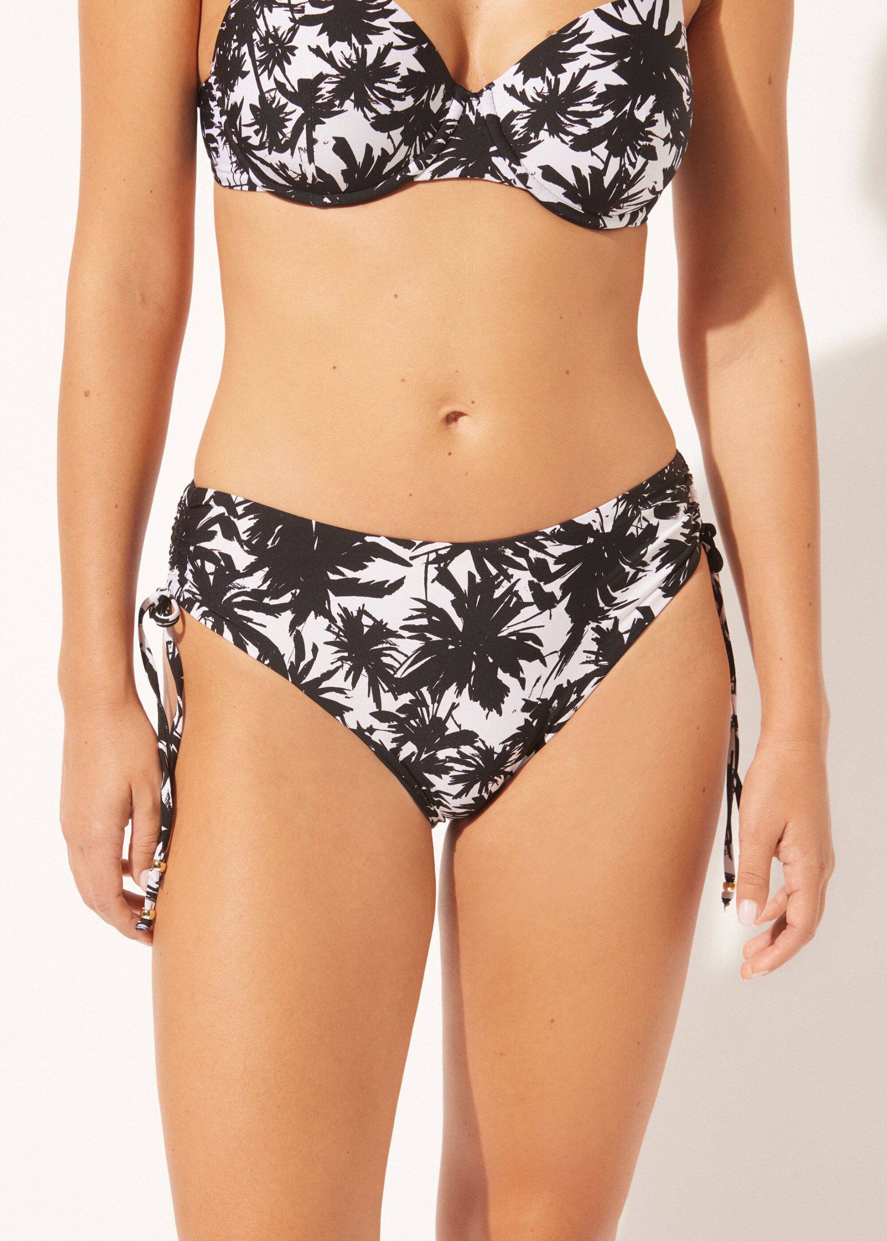 High waist bikini bottoms with side drawstrings to adjust the fit of the leg openings. The style features a black and white palm tree patterned fabric. Fully lined and with invisible seams.