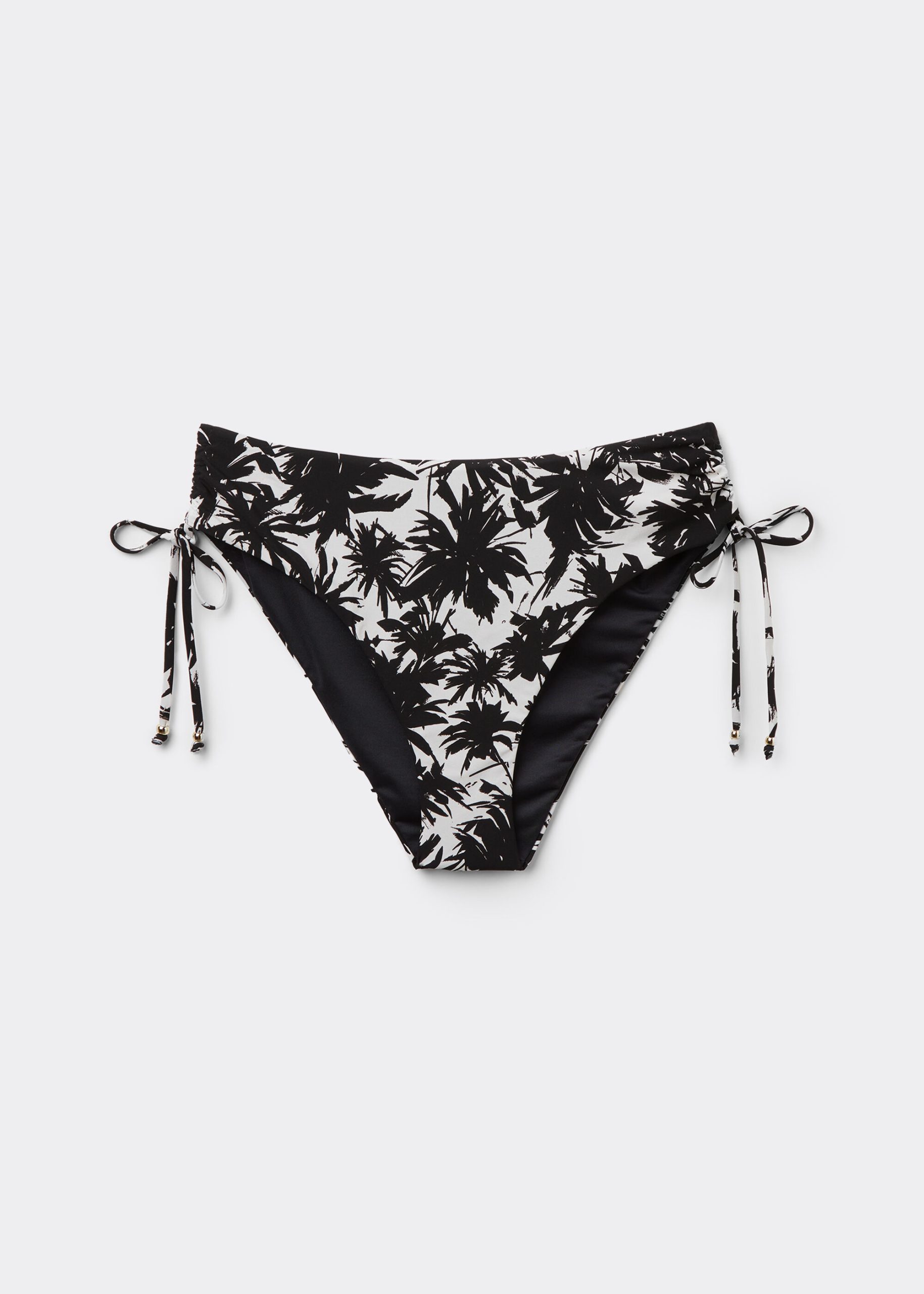 High waist bikini bottoms with side drawstrings to adjust the fit of the leg openings. The style features a black and white palm tree patterned fabric. Fully lined and with invisible seams.