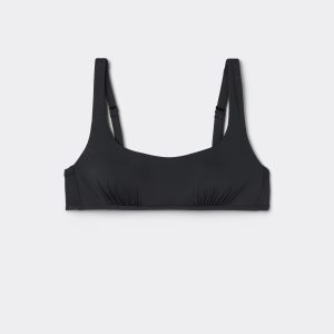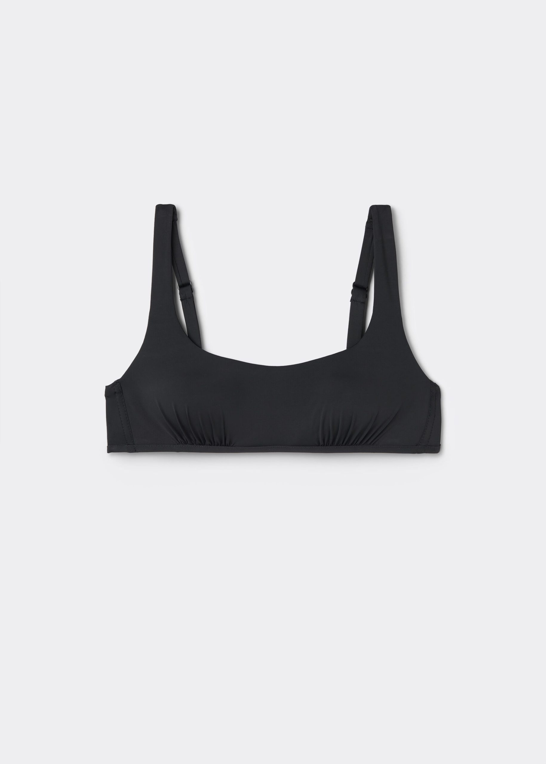 Lightly padded wireless tank-style bikini top with gathers at the underbust. The cut of the unique cup and the side boning guarantee good support and maximum comfort. The extremely soft fabric makes it pleasant to wear, offering a light and comfortable feel on the skin. Adjustable and removable straps may be crossed at the back. Back hook-and-eye closure and adjuster to improve the fit of the band.