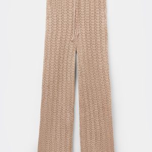 Long crocheted golden lamè pants with drawstring at the waist, perfect to wear on top of beachwear or for special chic appeal occasions. Elegant and versatile, they offer a relaxed fit and a note of brightness due to the lamè yarn.