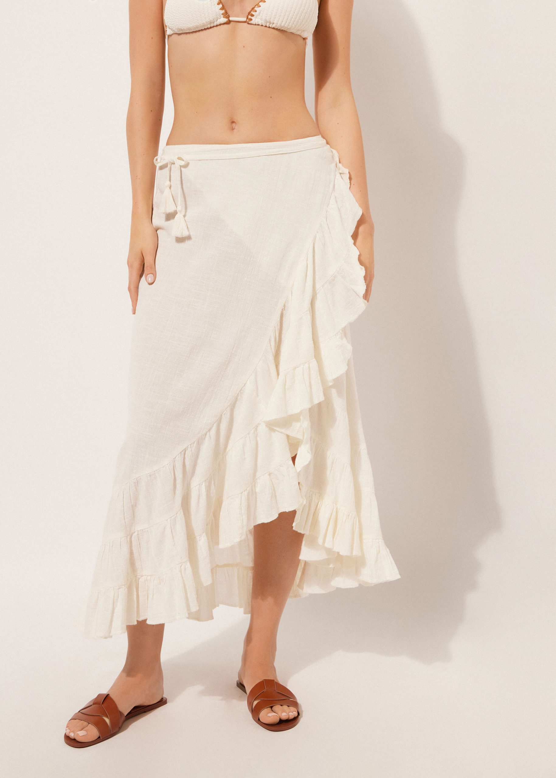 Long cotton skirt with ruffle, perfect as a cover-up or for a summer outfit. Its length and lightweight fabric guarantee comfort and freshness, while the ruffle adds a feminine touch. Suitable for the beach, going for a stroll or a casual summer look.