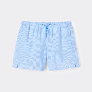 Men’s swim trunks with a gathered covered elastic waistband and two-tone exterior drawstring to adjust the fit. Regular fit with above-the-knee length, side welt pockets, and inner mesh. Back patch pocket with flap and Velcro closure. Yarn dyed cotton feel seersucker fabric, unique for its three-dimensional effect and stripe pattern. Opaque, built-in briefs made from soft fabric. Available in different colors.