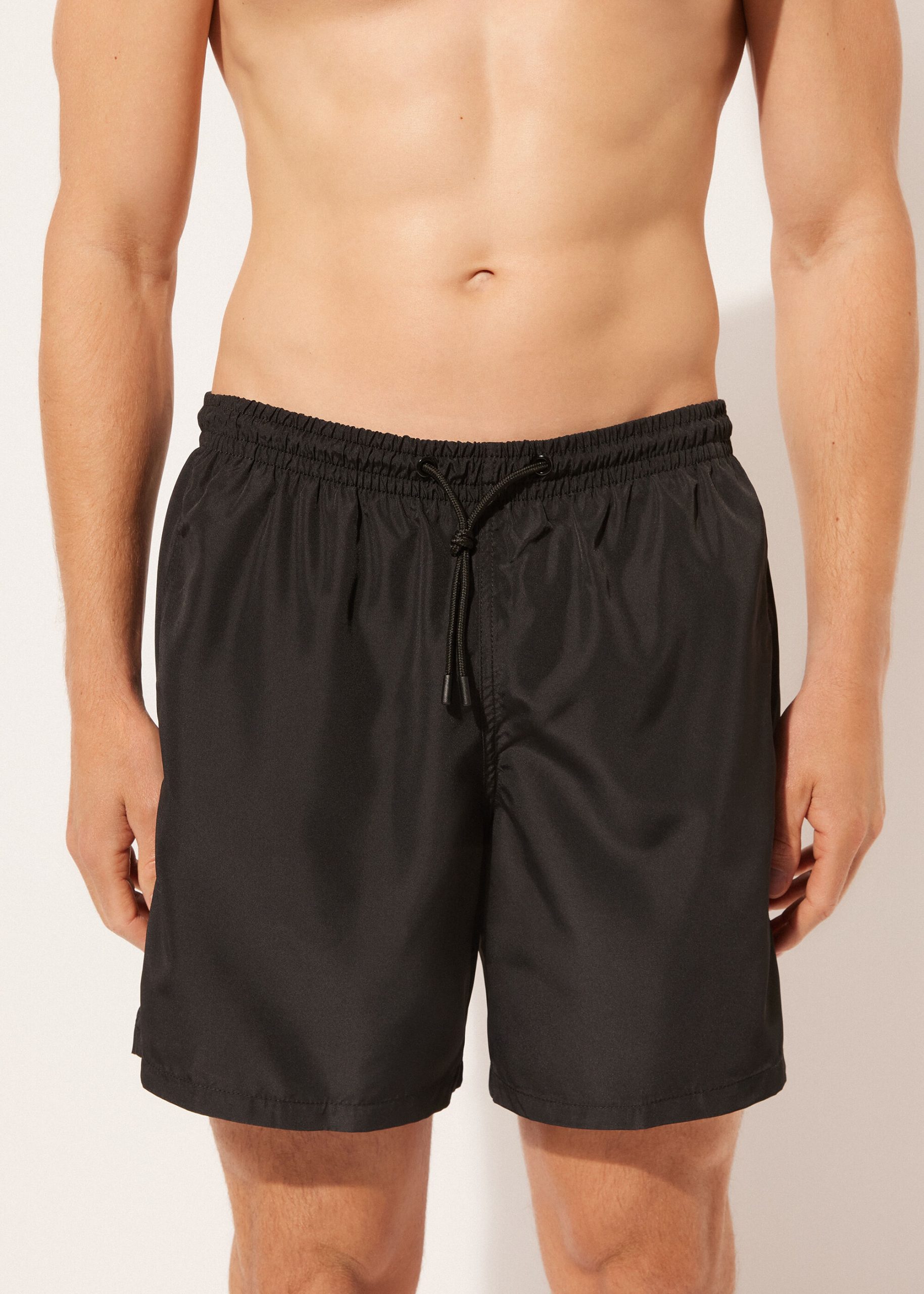 Men’s swim trunks with elastic at the waist. Drawstring with colored tip. Mid-thigh length with side welt pockets and internal mesh. Back patch pocket with logo. Quick-drying soft and comfy fabric.