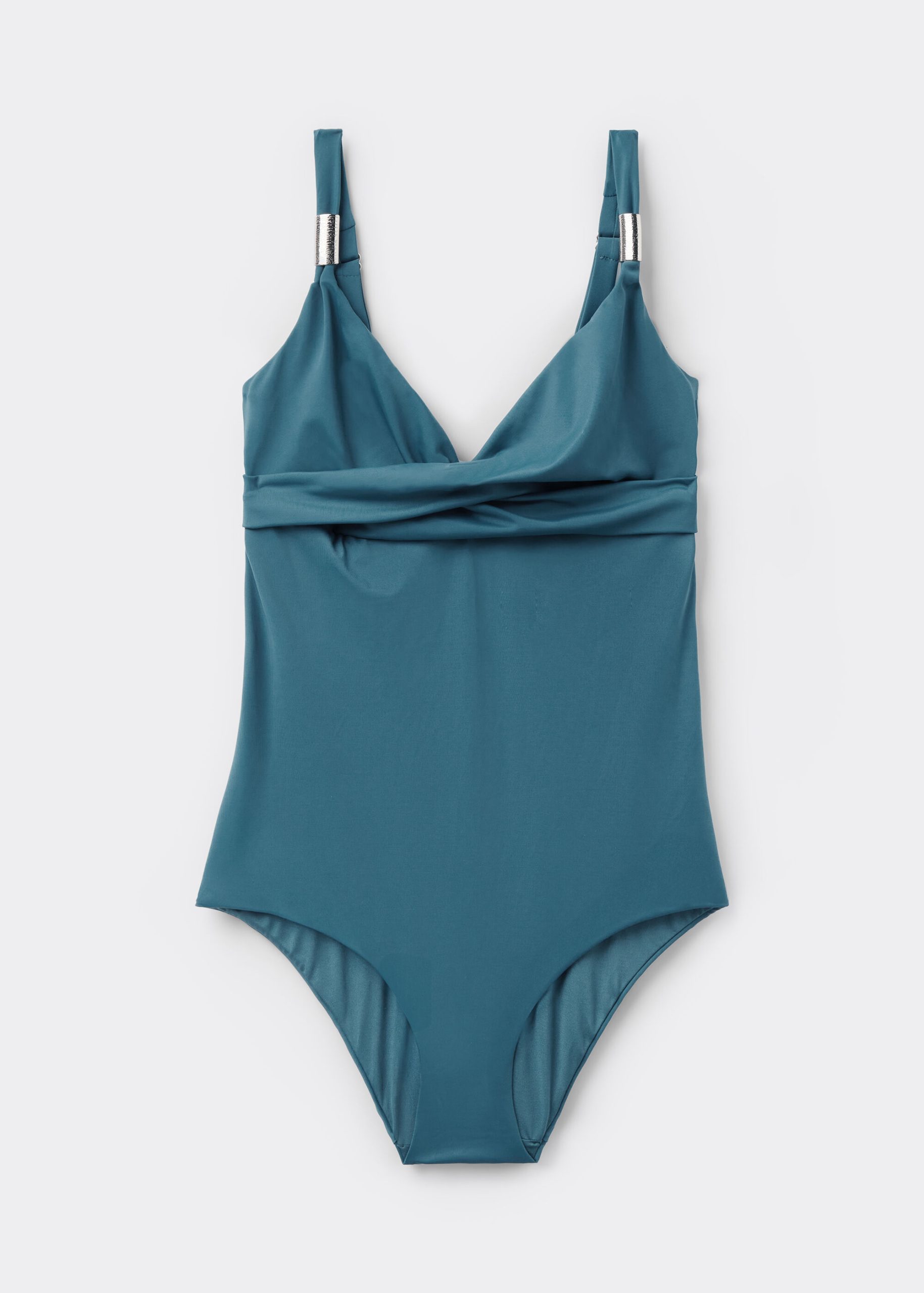 One piece swimsuit with a deep neckline, featuring wireless and unpadded cups for a natural effect. The structure of the cups and the wide fit at the sides provide good support for larger busts. The compact fabric, designed to exalt and enhance the body’s curves, ensures excellent containment and is studied to make every woman feel at ease without constraint. Adjustable shoulder straps. Back closure with two hook-and-eye closures to improve the fit of the underband. Regular bottoms coverage in back.
