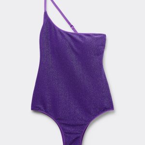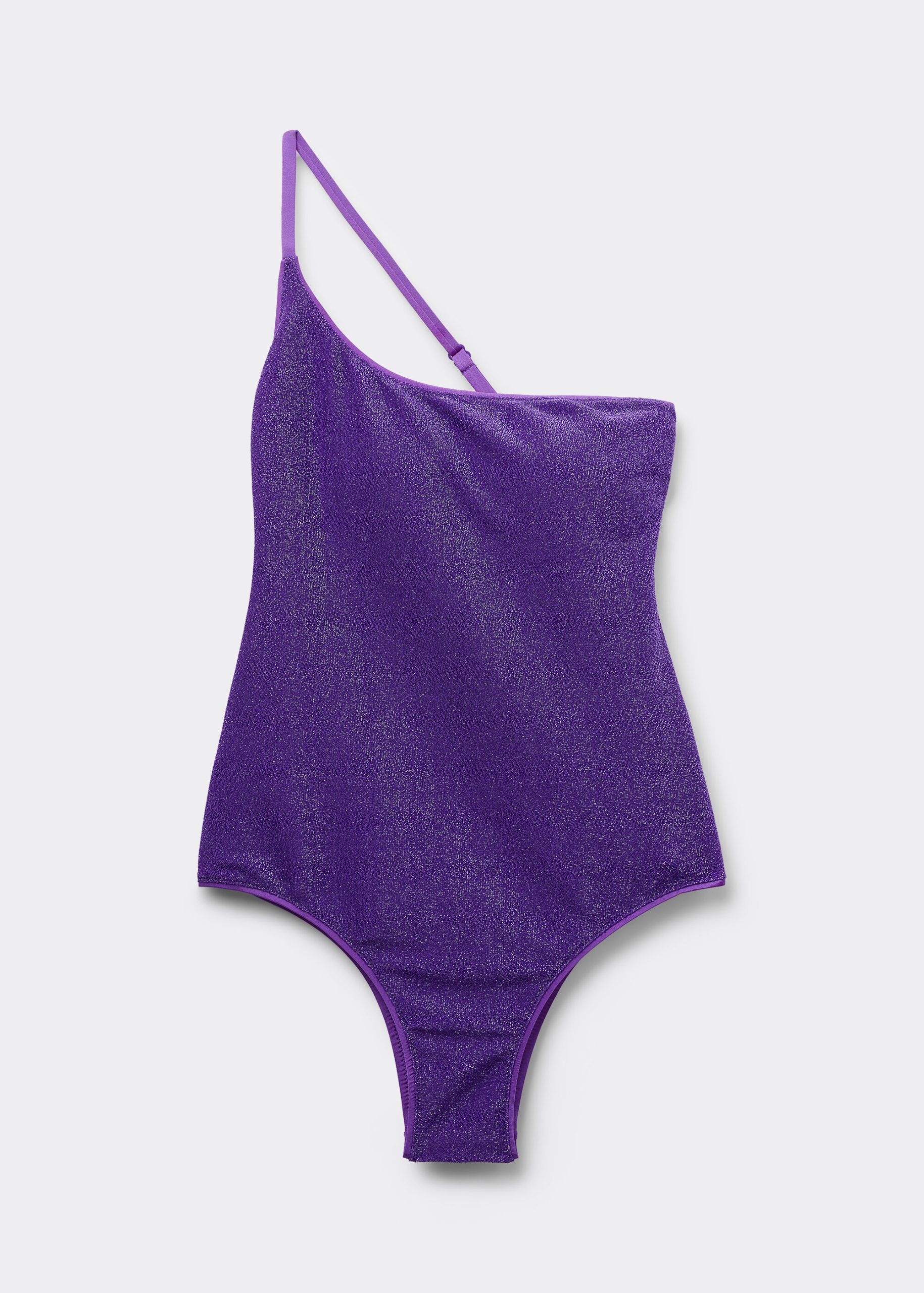 One shoulder one piece swimsuit in stylish shiny lamé fabric with lightly padded wireless cups for discreet comfort. Fully lined and with invisible seams, it offers a high-leg fit, enhancing the silhouette with style and elegance.