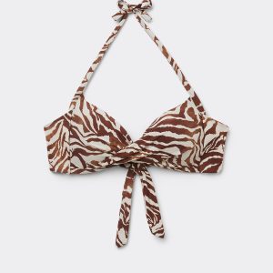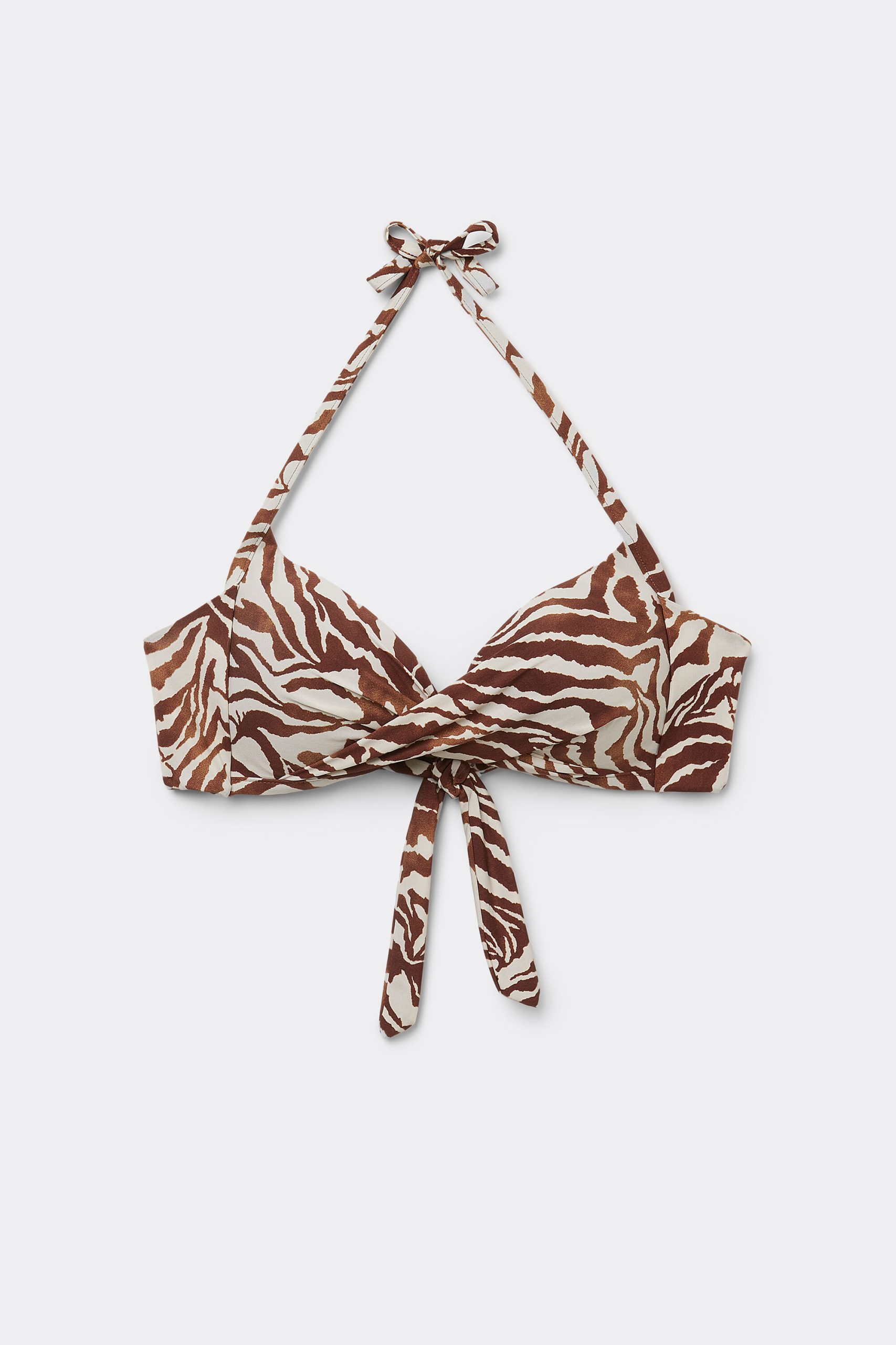 Wireless fixed triangle bikini top with graduated padded cups that add volume. The crisscross on the neckline enhances the décolleté. The style features a sophisticated Brown Zebra print. The shoulder straps have eyelets on the ends so they can be hooked onto the back band or tied behind the neck. Back tie closure. The cups in size XL/40 are lightly padded.