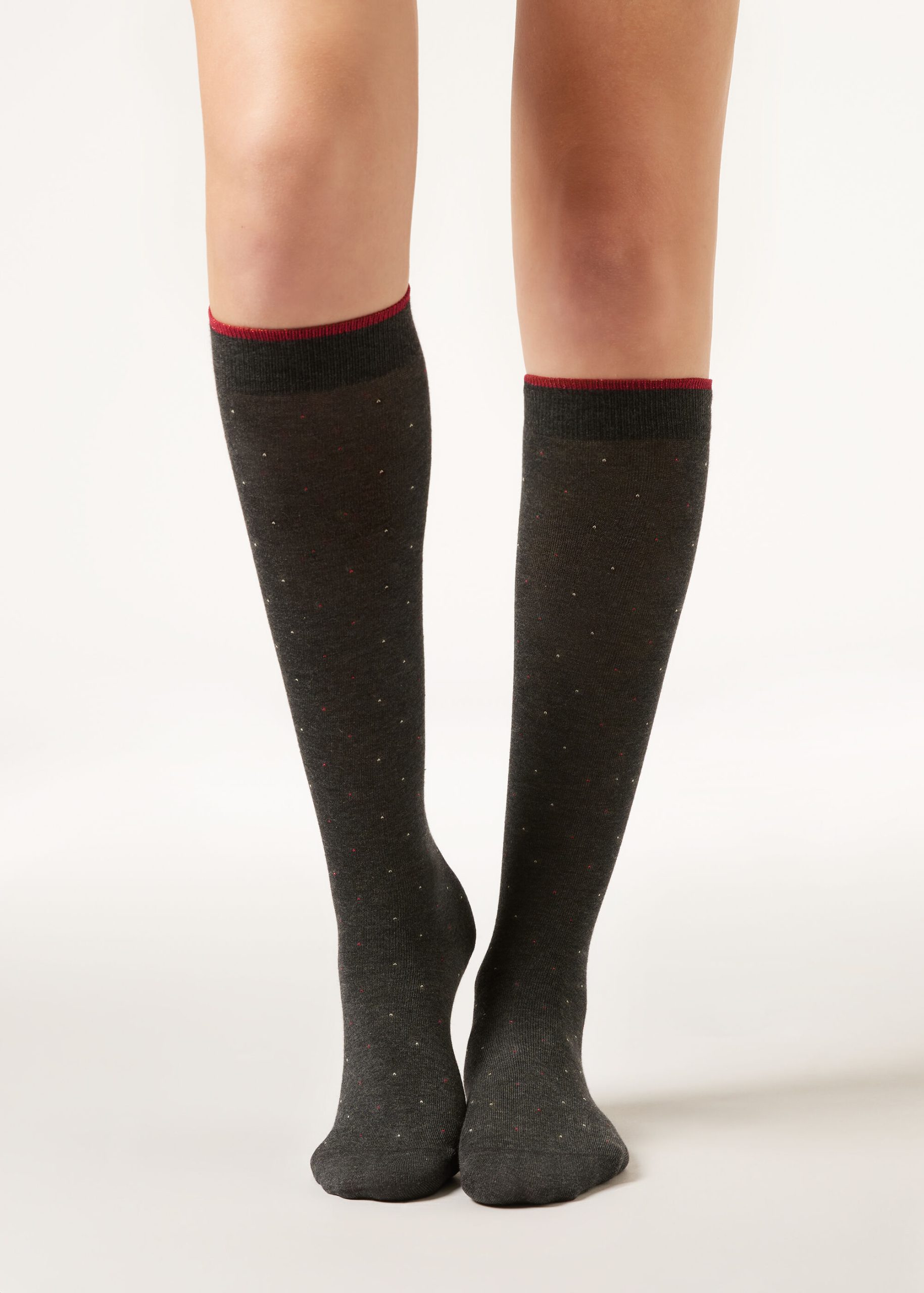 Women’s long cotton socks with elegant foulard pattern. Comfortable and durable, featuring soft elastic for a perfect fit.