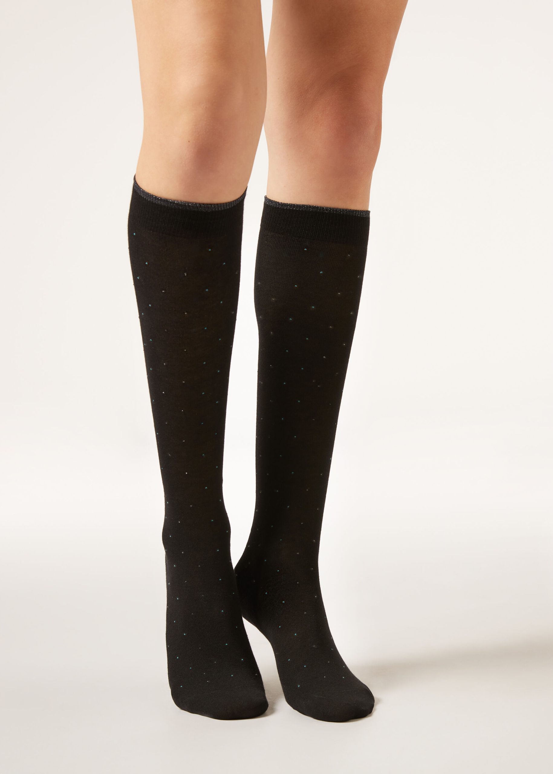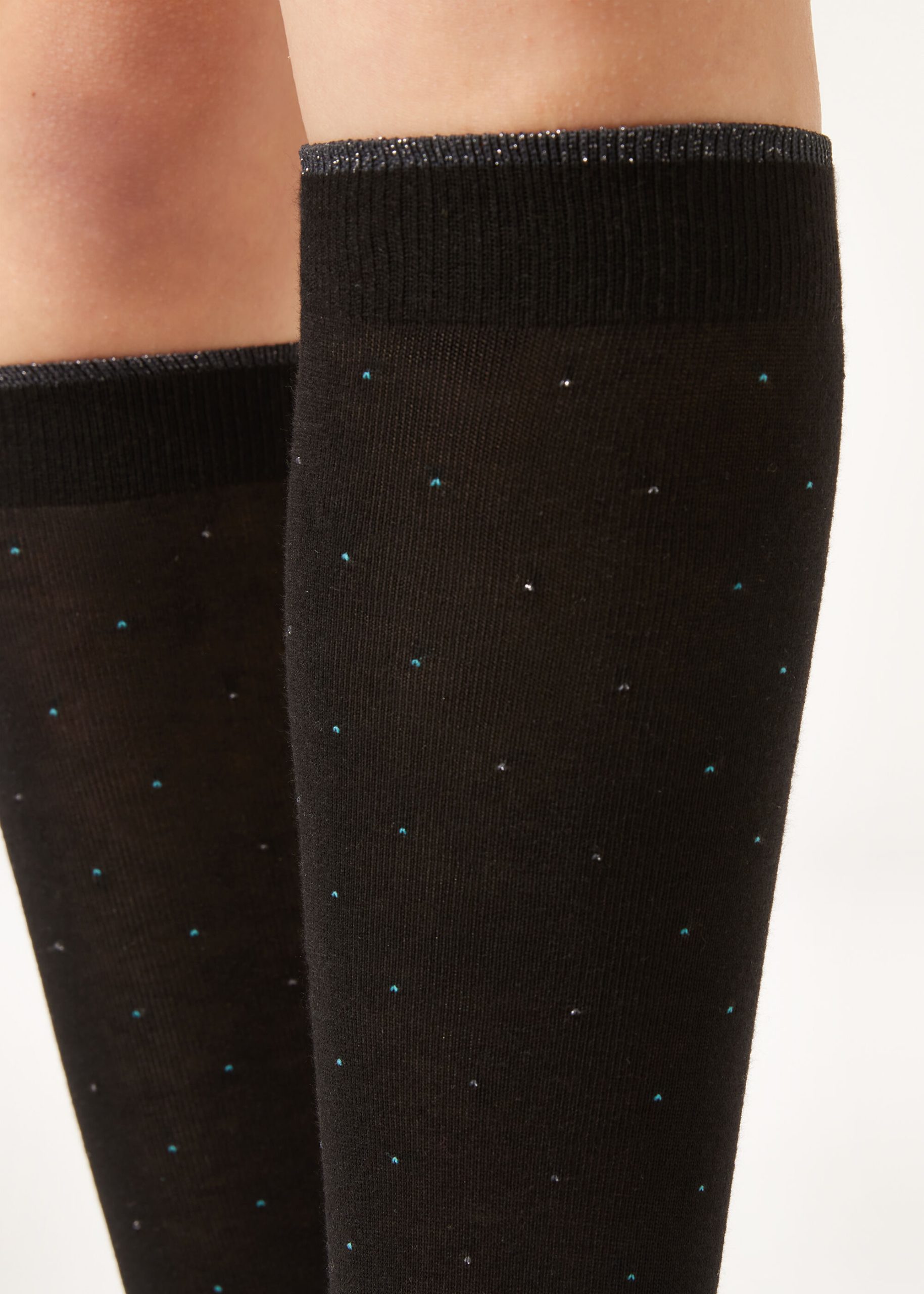 Women’s long cotton socks with elegant foulard pattern. Comfortable and durable, featuring soft elastic for a perfect fit.