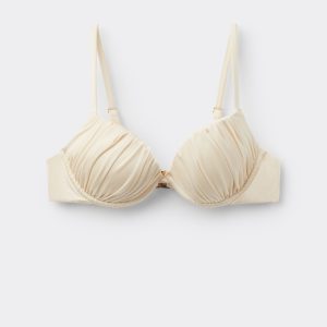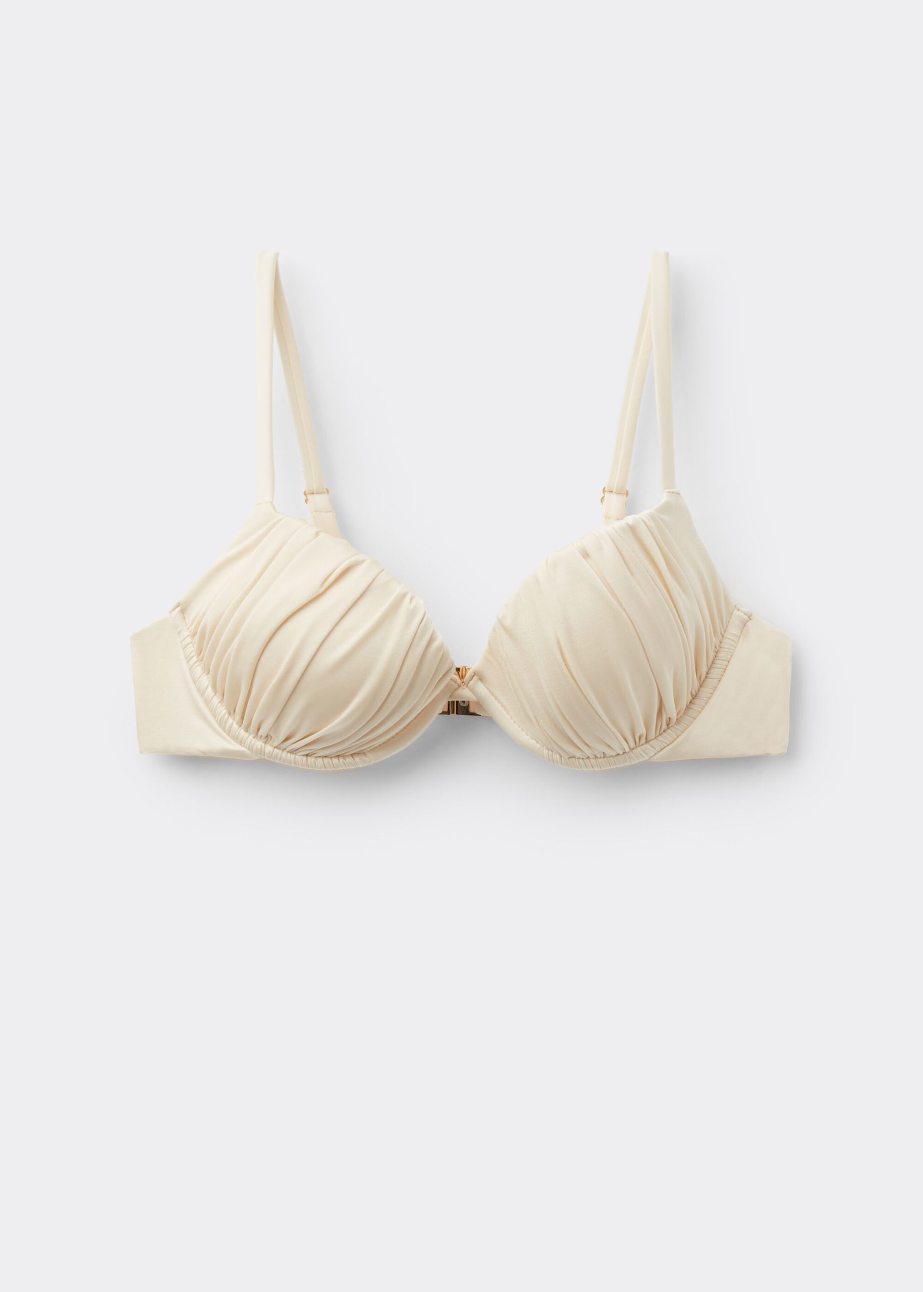 Push-up bikini top with lightly padded cups and underwire to guarantee support and provide volume. The style features a bright fabric with a silky effect. Fixed Shoulder Straps. Rear closure with double adjustment hook.
