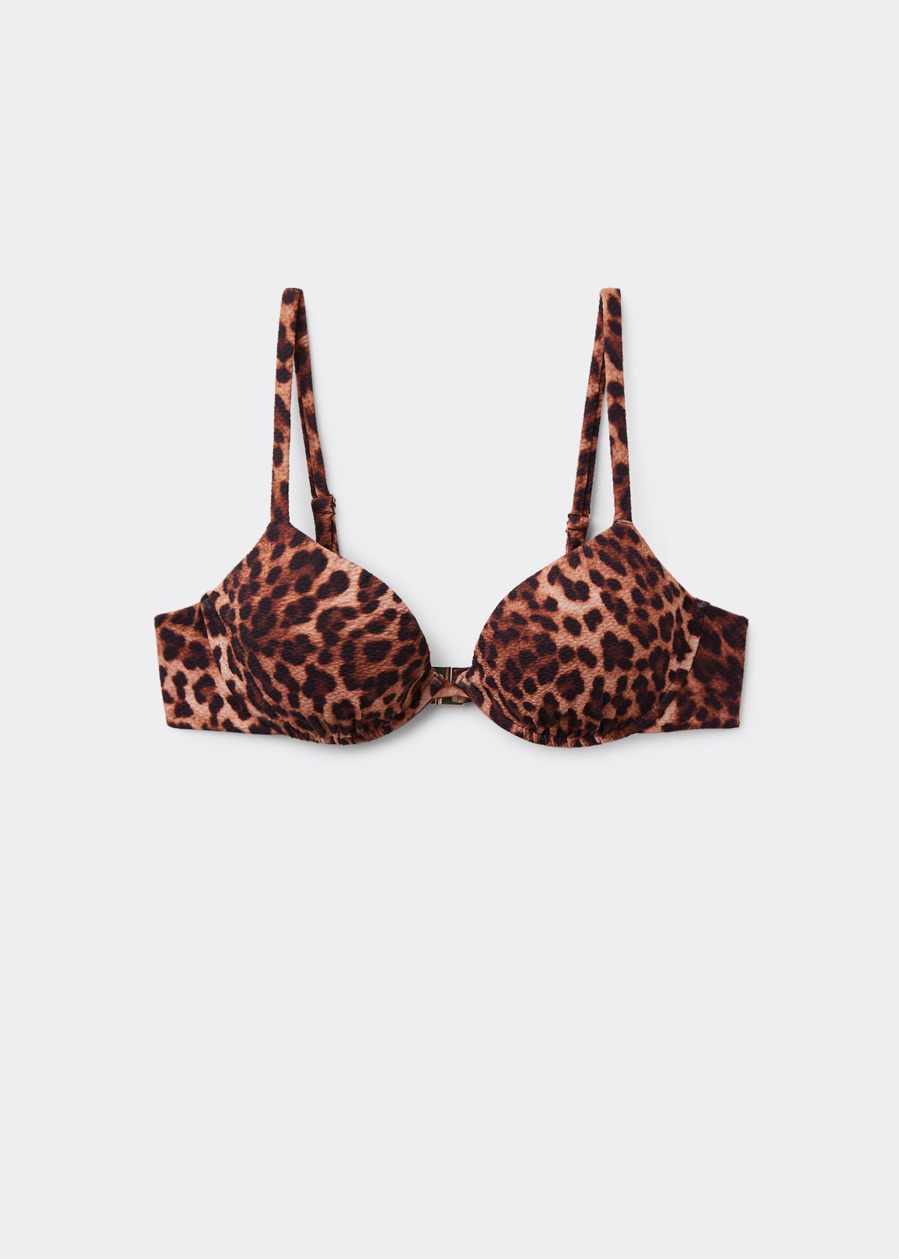 Push-up bikini top with lightly padded cups and underwire to guarantee support and provide volume. The style features an elegant animal pattern and lightly ruched fabric. Removable shoulder straps may be crossed at the back and tied behind the neck. Back hook closure with two adjusters.
