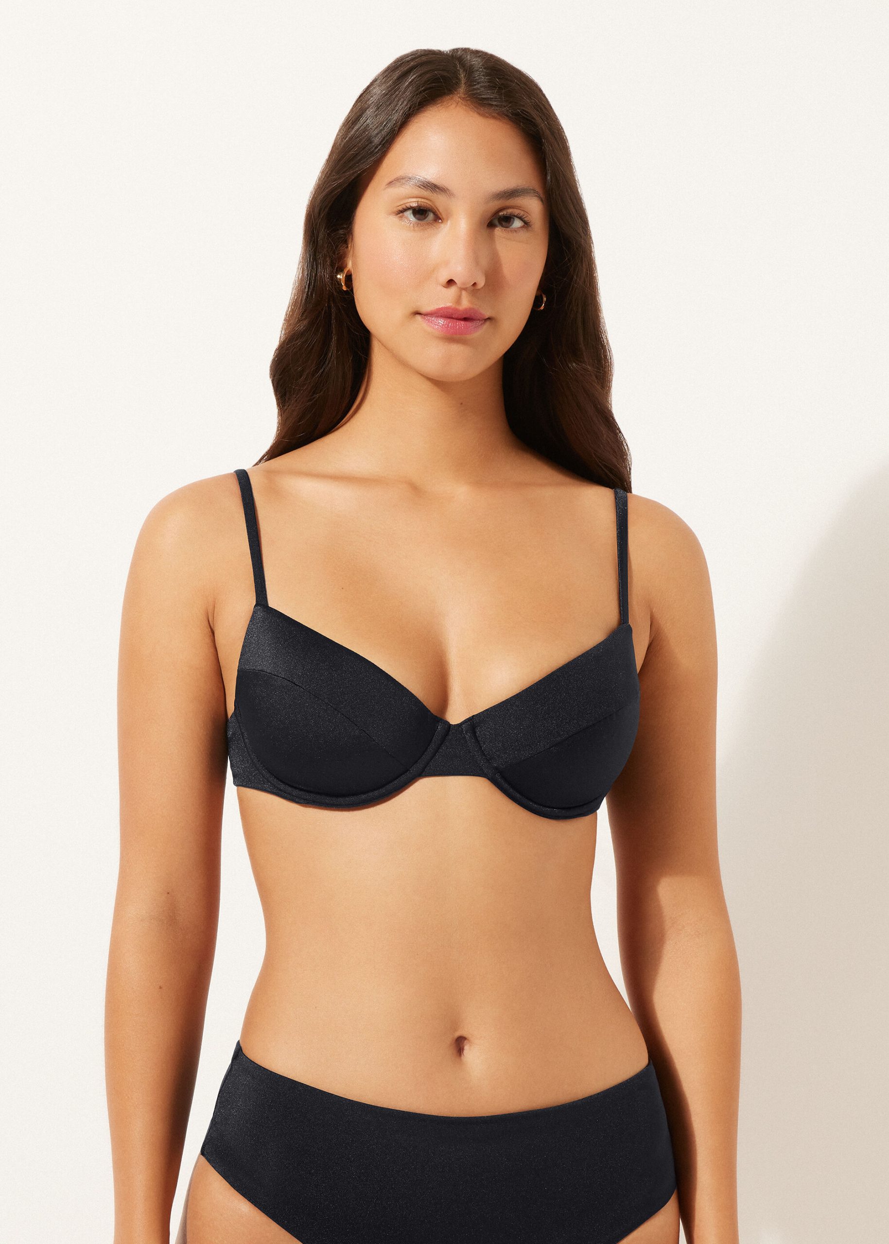 Push-up bikini top with lightly padded cups and underwire, designed to offer volume and a chic and refined appeal. Made from a bright fabric, it features an elegant bustier effect on the back, embellished by a sophisticated crossing of strings that exalt its sensual design. The adjustable shoulder straps and string tie fastening on the back offer a personalized fit, perfect for an elegant and modern summer look.