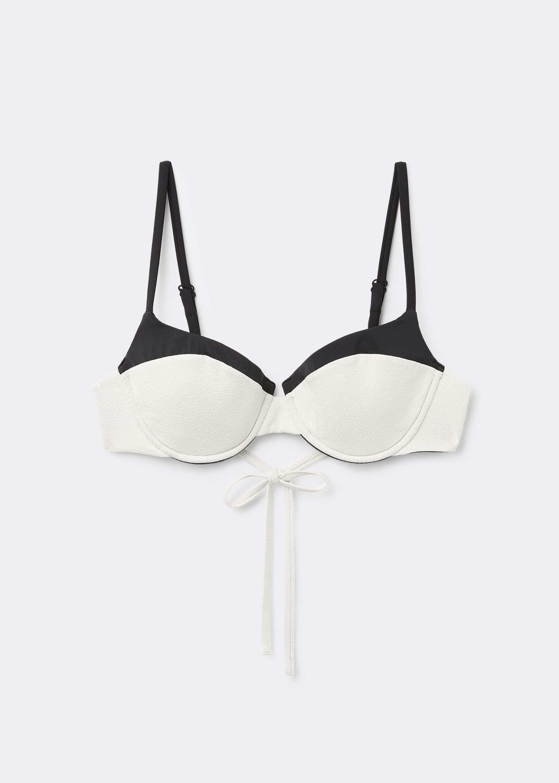 Push-up bikini top with lightly padded cups and underwire, designed to guarantee support and provide volume. Featuring a refined design, it stands out due to the elegant layering effect that adds a touch of fashion and sophistication, perfect for a chic and modern summer look. The adjustable straps and string tie closure on the back ensure an adjustable fit.