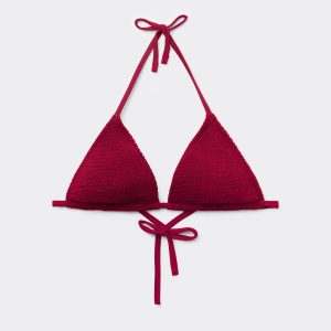 Slide triangle bikini top with removable cups and no underwire for a natural effect. The style features a crinkle fabric with a three-dimensional effect. The shoulder straps have eyelets on the ends so they can be hooked onto the back band or tied behind the neck. Back string tie closure.